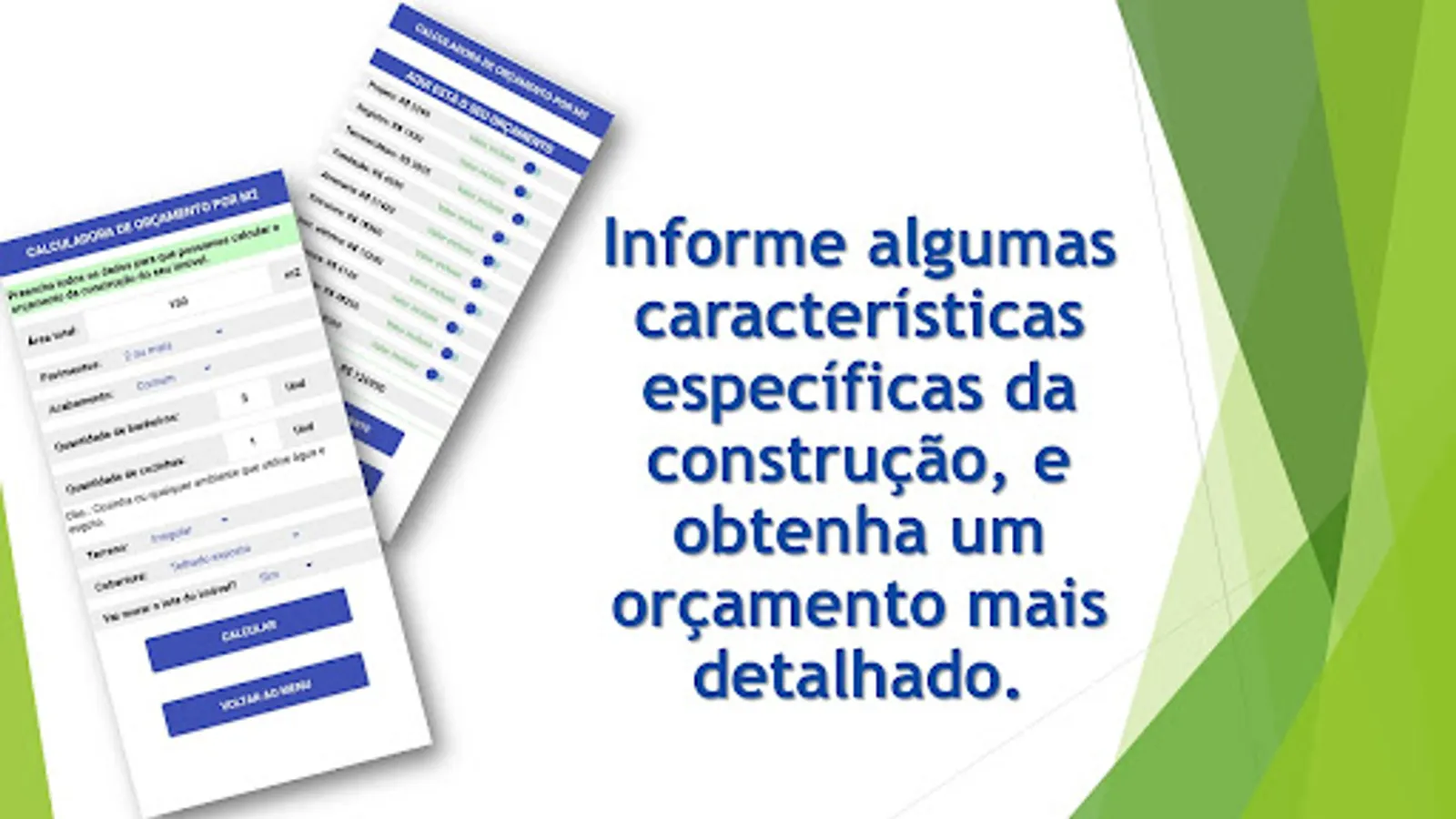 The application was developed by a civil engineer who works in the area of budgeting, bringing to the application all the complexity of preparing a budget in a simple way, so that anyone can use it and have an idea of cost before starting the investment. in a building.