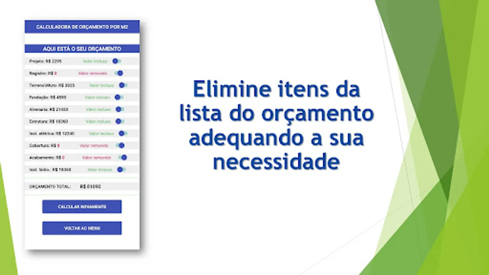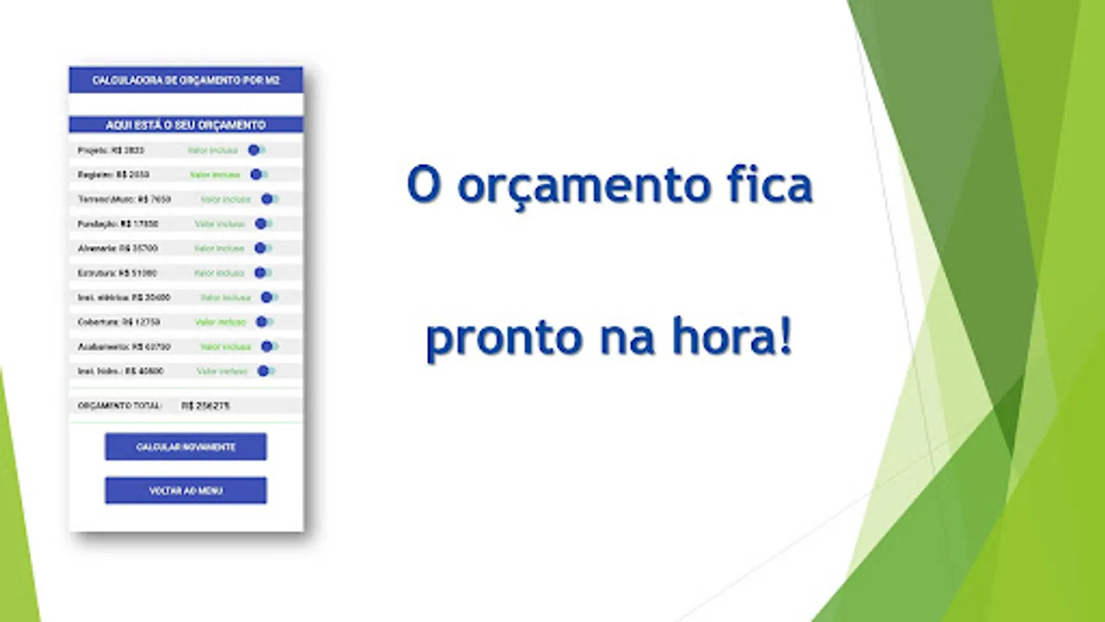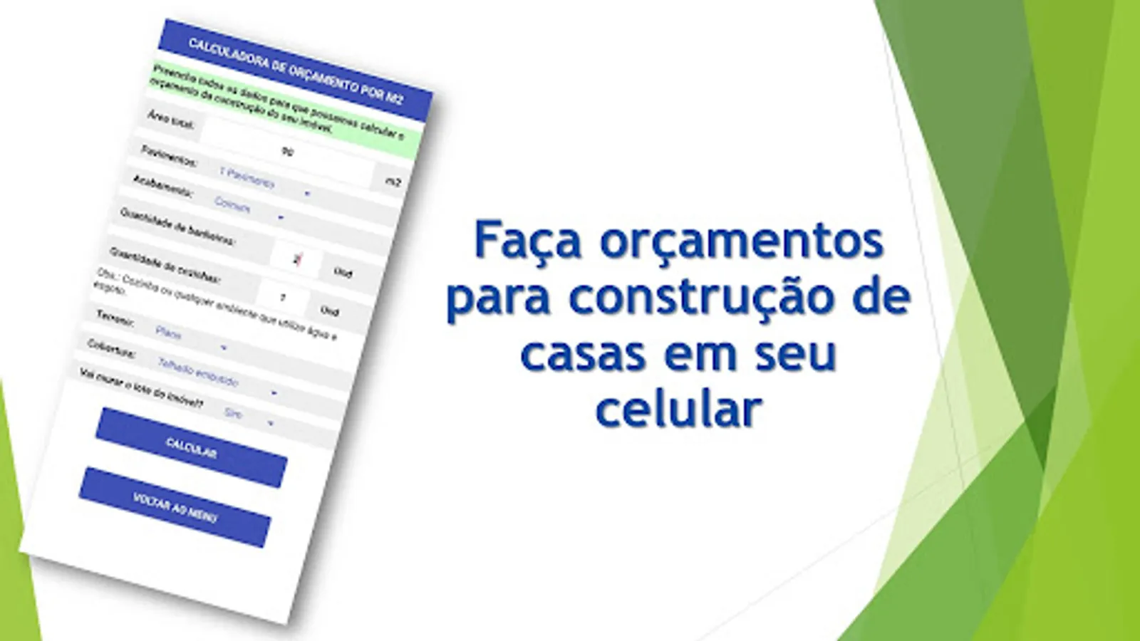 Our application “House Budget per m2” estimates a house based on its area, informing the cost of each stage of your work and also the total cost.
