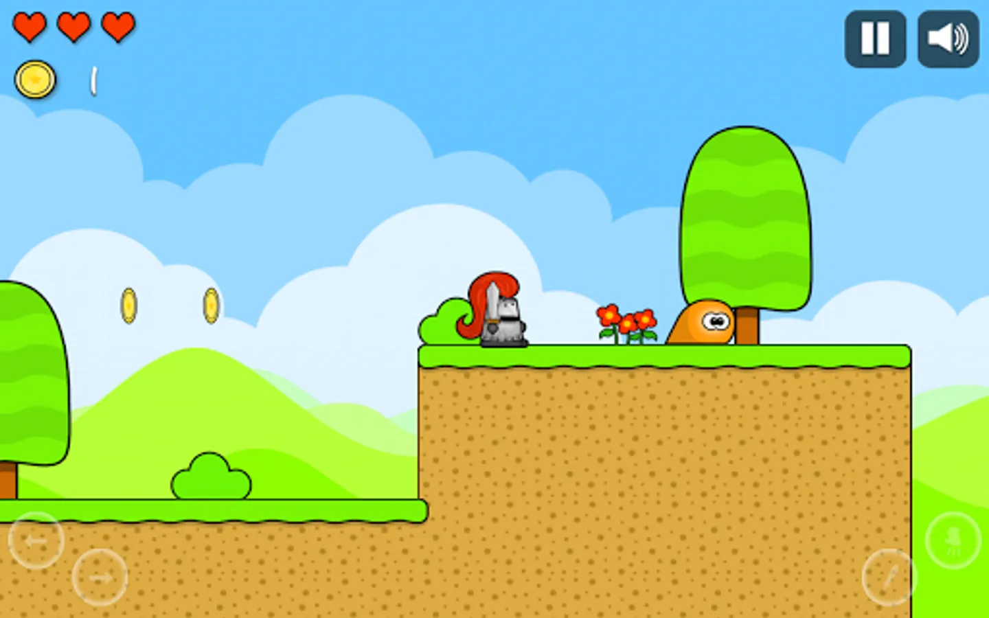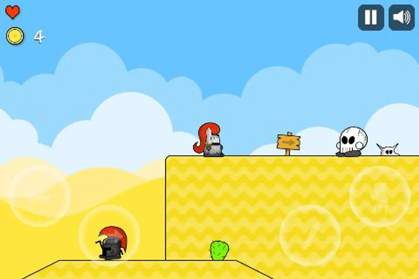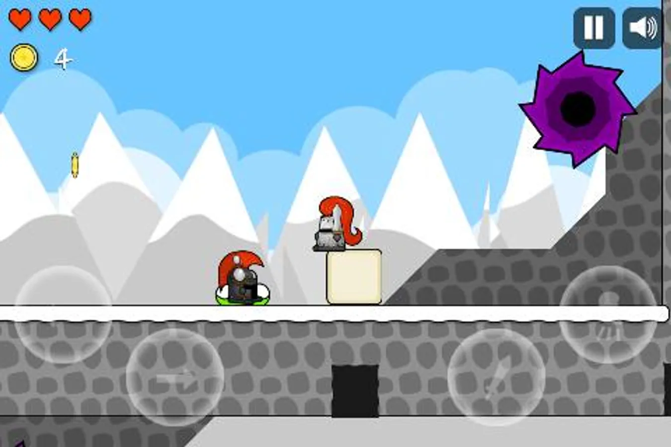 Help the knight run, jump and avoid obstacles. Use portals to gain access to otherwise unreachable parts of the terrain. Fight enemies like snails, slimes, snakes, skeletons, flame shooting plants, ice monsters and the very formidable forces of the Black Knights, across 30 levels spanning 3 different locales - the Plains, the Desert, and the Snowy Mountains. Collect coins and purchase health and potion upgrades.