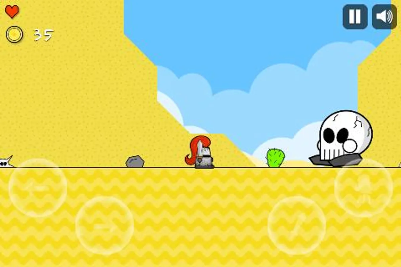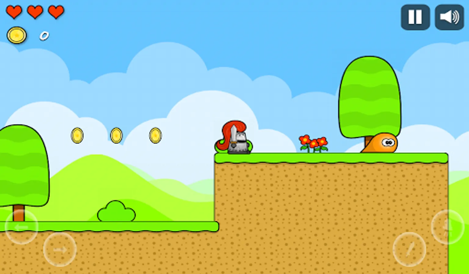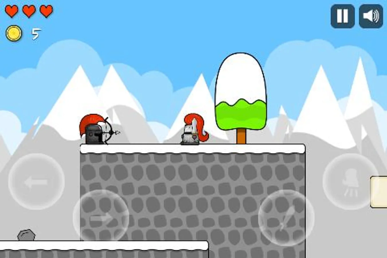 Help the knight run, jump and avoid obstacles. Use portals to gain access to otherwise unreachable parts of the terrain. Fight enemies like snails, slimes, snakes, skeletons, flame shooting plants, ice monsters and the very formidable forces of the Black Knights, across 30 levels spanning 3 different locales - the Plains, the Desert, and the Snowy Mountains. Collect coins and purchase health and potion upgrades.