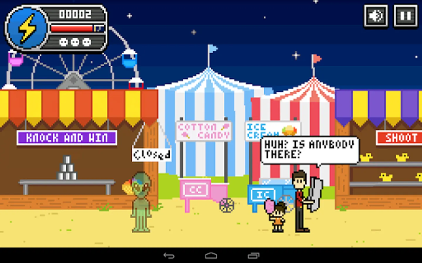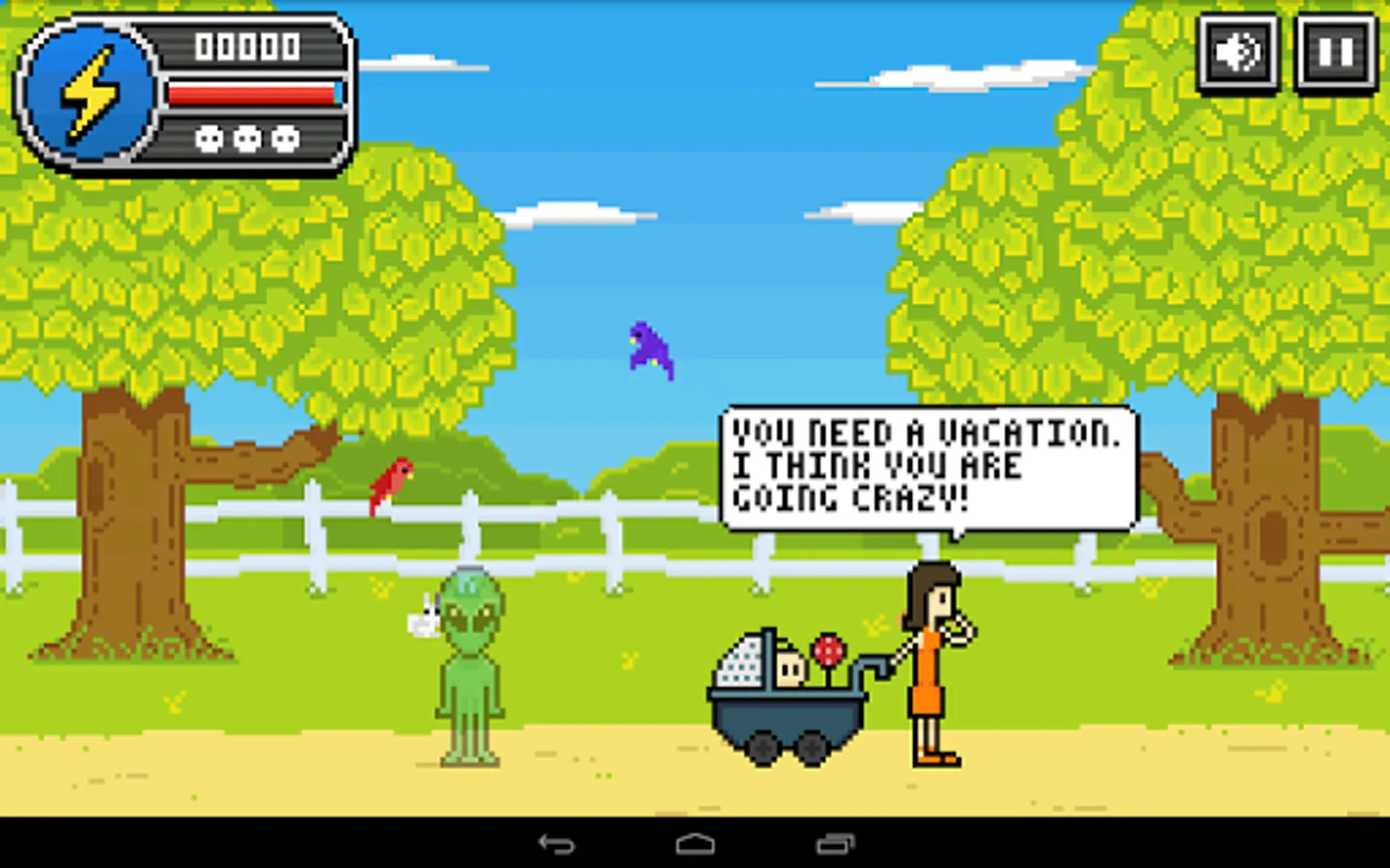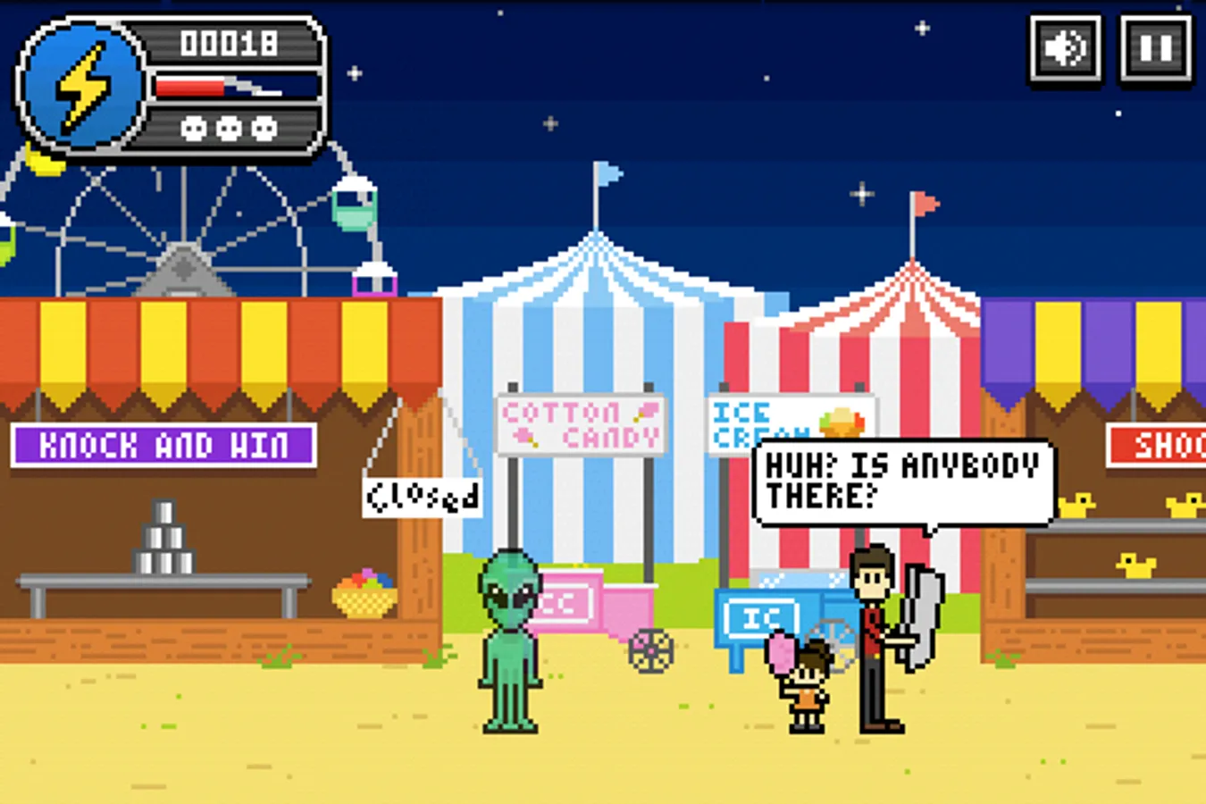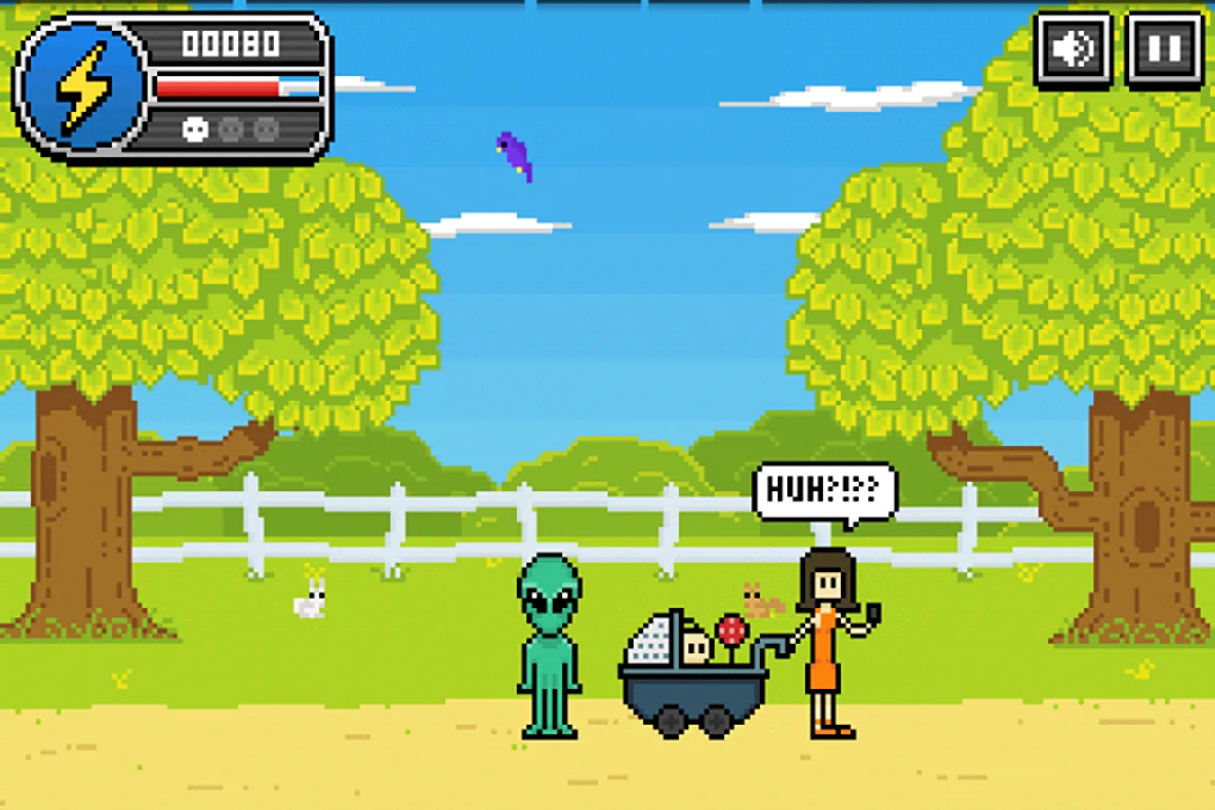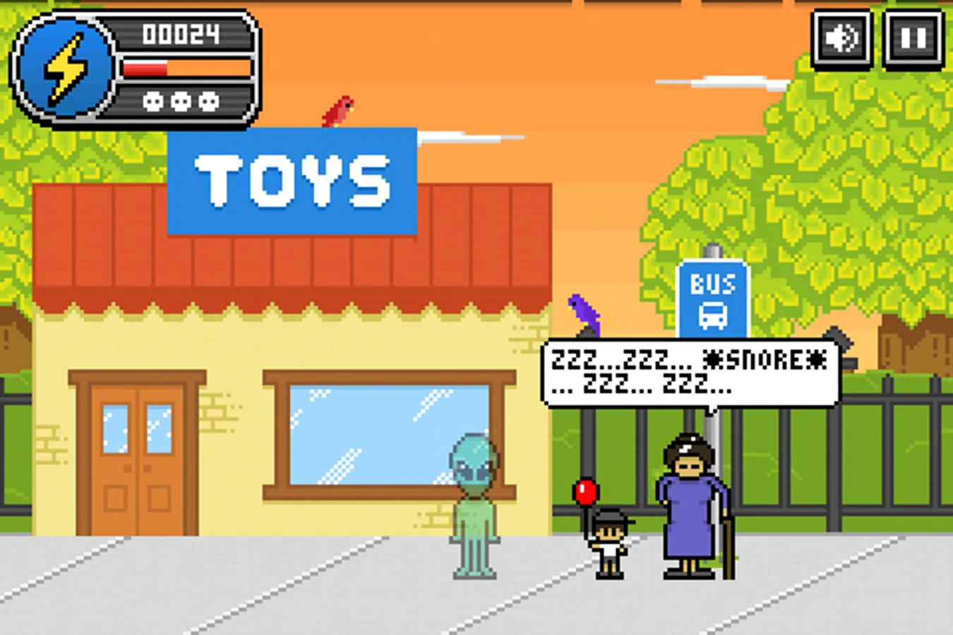 Zie Invades Earth is a simple one button minigame. Zie, the alien, has arrived on Earth with the intention of stealing from young earthlings, all those things that they hold dear, including candy, balloons etc. Can you help him in his mission?