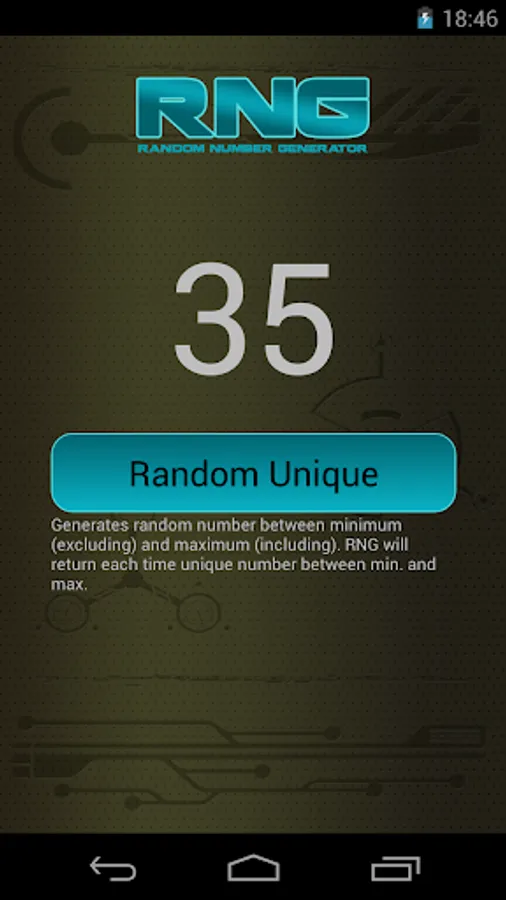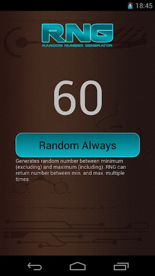 Application generates random numbers. All you need to do is to set minimum and maximum value and you can start generate numbers.