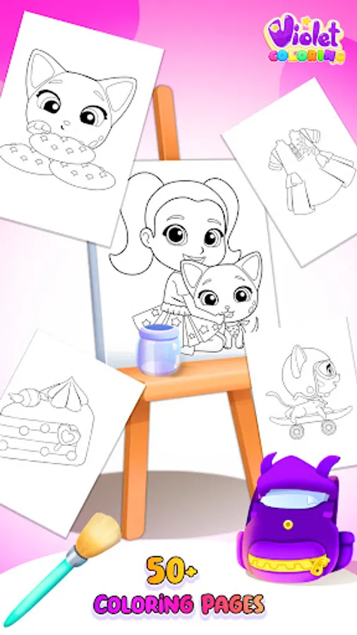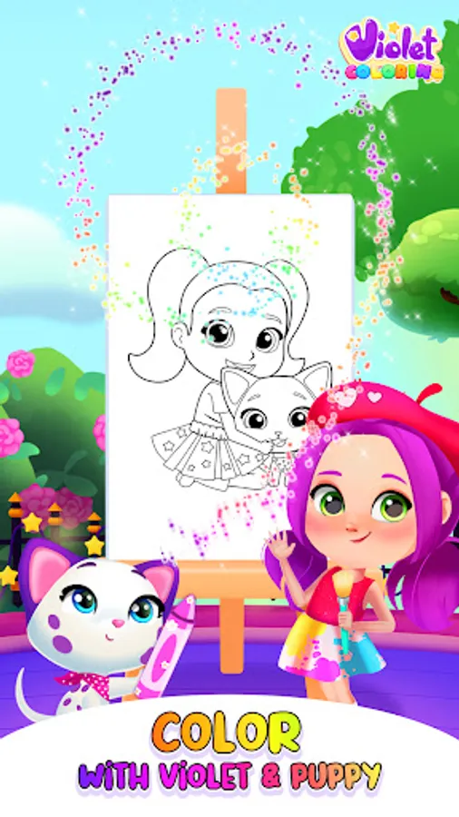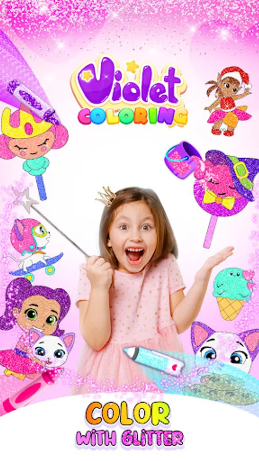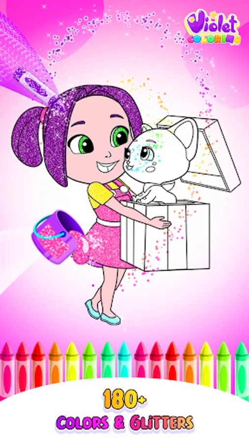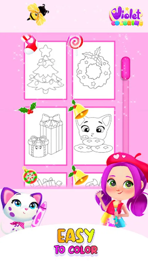 Color beautiful drawings alongside an amazing friend named Violet. You should start by picking the drawing that you like the most. We have tons of coloring pages you can choose from such as cats, delicious deserts, elves, dresses, Christmas trees, presents, pictures with Violet and her little pet and so many others. After you chose the design, you liked best, use the tools at your disposal. Select a cool pattern like stripes or polka dots or opt for a more unique look and add glitter everywhere. The sparkles come in a lot of different shades and colors so you should try all of them out before making a final decision. The background is so plain and boring right now: paint it a vibrant color and add little details to make the drawing stand out. There are over 180 colors and glitter shades for you to pick from. Use crayons for an effortless look and if you are in the mood for something more artistic choose the paint brush. When choosing the paint observe how different tools have different strokes. The result will depend on the tools you have worked with so far. The colored pencils are also a good option because they are very pretty and easy to use. If you made a mistake do not stress about it. Just press the button located on the top left corner of the screen and tap over the area you want to erase. If your picture needs something to make it look even more special than it already does go to the sticker section of the game and attach a couple of them. There are over 70 stickers including a lady bug, a bee, a glazed donut, a paper plane and so on. Just in time for the Holiday Season we have prepared an adorable gift for you. Christmas-themed drawings that you can color and decorate to your liking. Add green, red, white and yellow for a more festive look. Do not forget to add a lot of glitter to make it look even better as it did before. After finalizing your masterpiece save it and go to your gallery. There, all of the drawings you have completed will be showed.
