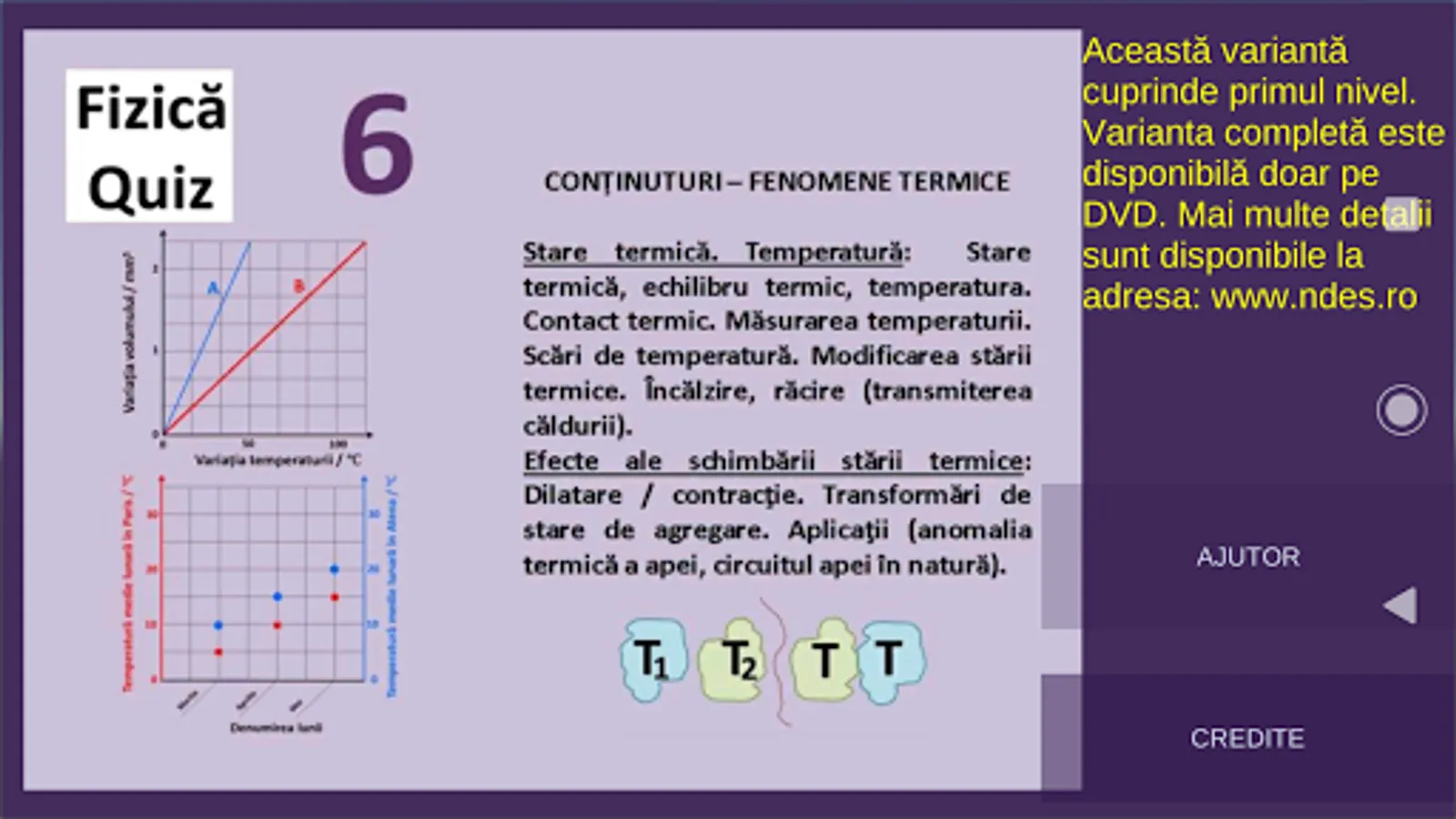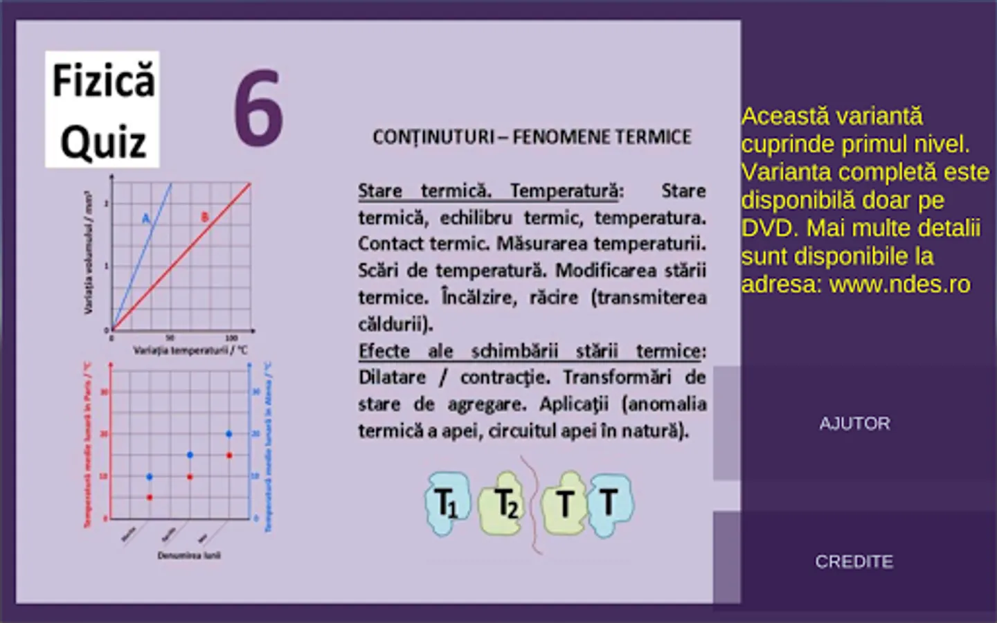 The package contains objective evaluation items, organized in tests. In formulating the items, the competencies and contents of the chapter “Thermal phenomena” that can be found in the physics program for the sixth grade, from Romania, were followed. The software application can be used by all those who are passionate about physics.
