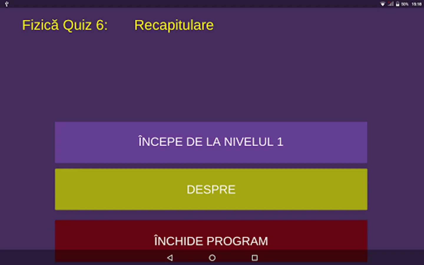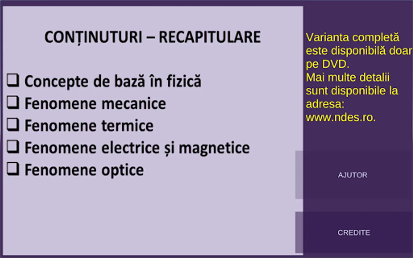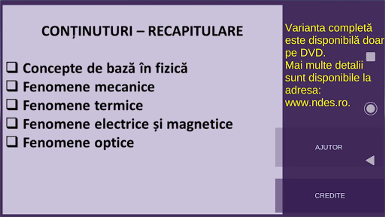 The package contains objective evaluation items, organized in tests. In the formulations of the items, the competencies and contents of the physics program for the sixth grade, from Romania, were followed. The software application can be used by all those who are passionate about physics.