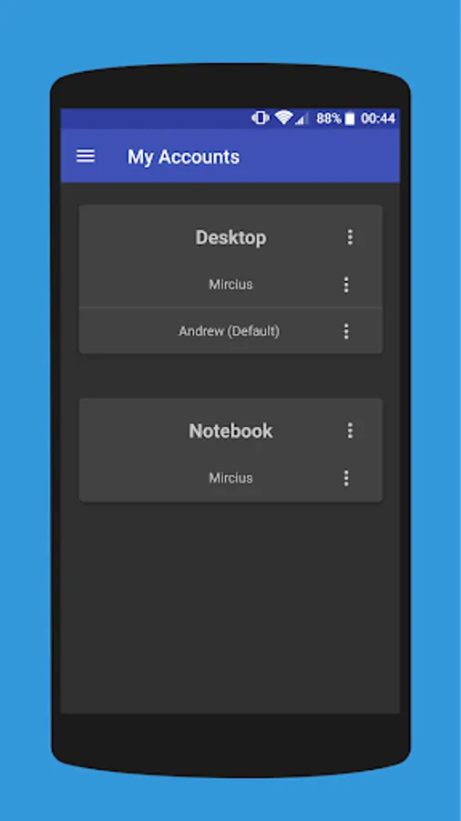 Now, go to the Accounts menu, tap the 3-dot menu button of the computer and then Add Account. Enter the Windows account that you want to unlock. Use the displayed name exactly as on the lockscreen (case sensitive, including the domain name if using domain account), together with the corresponding password. Scan your fingerprint and press Add.