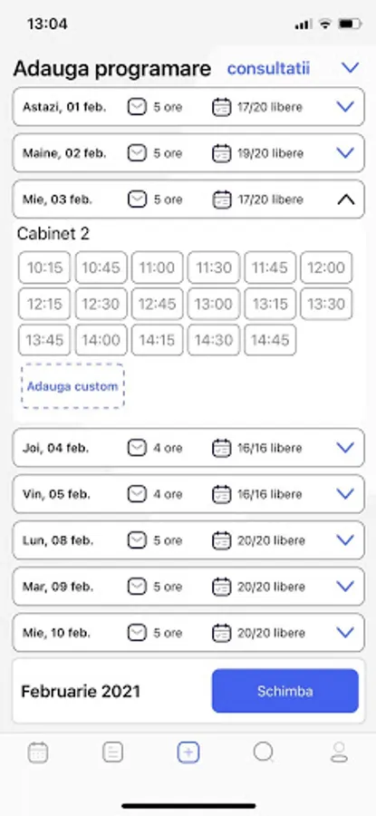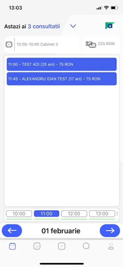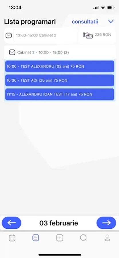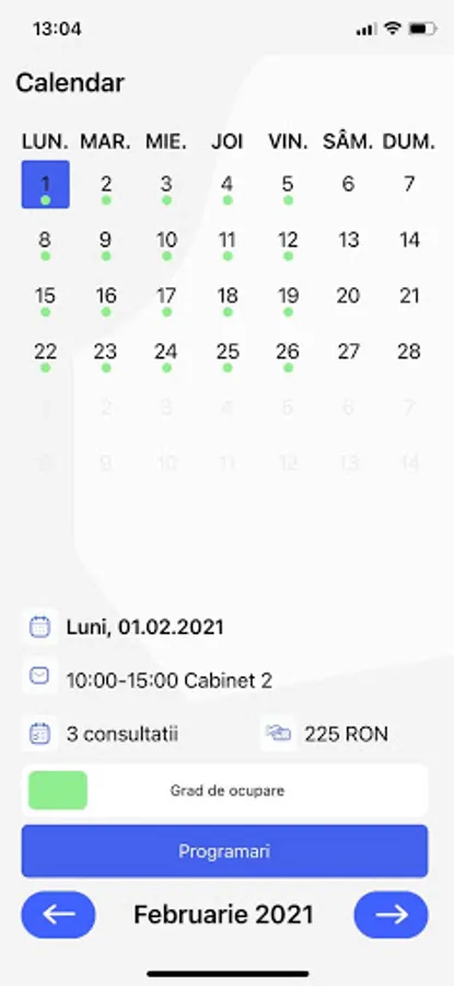 Utilizatorii vor putea sa-si consulte agenda zilnica de consultatii sau programul din sala de operatii, precum si calendarul de programari pe orice perioada, cu posibilitatea de adaugare rapida a unei programari noi.