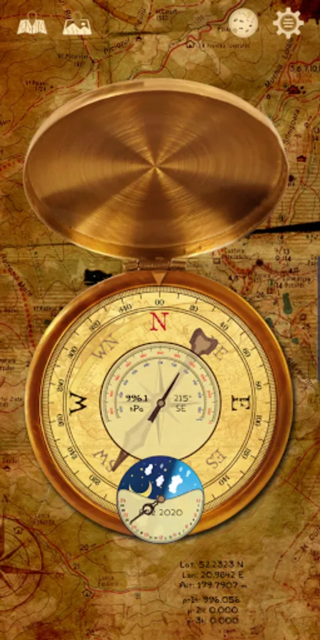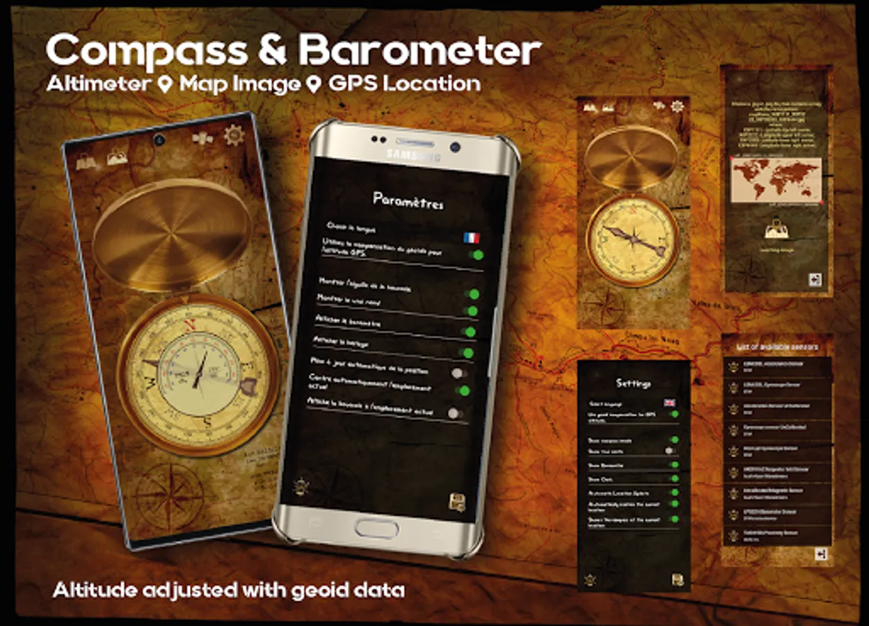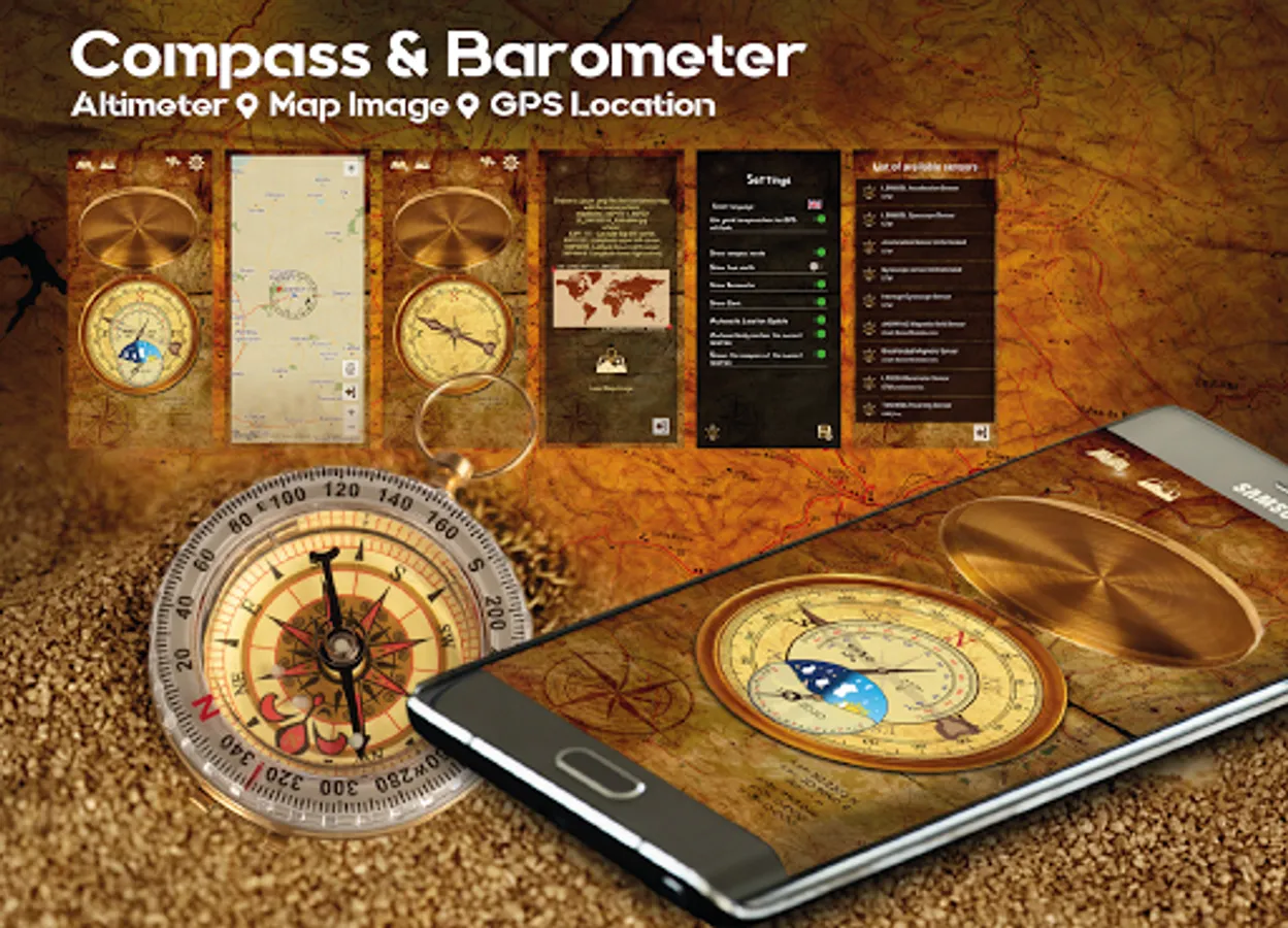 Compass and Barometer is a digital navigation tool used to determine the direction relative to the magnetic poles, to determine the current location and altitude of the device, record atmospheric pressure and other essential features (kml files for Google map, custom image static map navigation, GPS satellite skyview , list of available sensors).