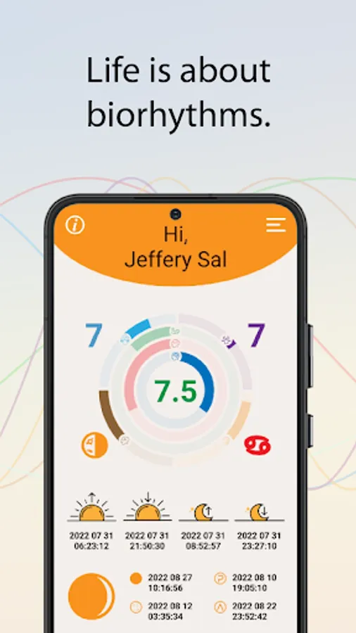 The application calculates your seven biorhythm for today and avarage of them. The results are displayed graphically, as percentage as arcs or bars. The seven biorhythms are physical, emotional, intellectual, intuitive, aesthetic, spiritual and awareness. The application calculates also the destiny, life path numbers, zodiac sign and give them descriptions. What's more, you can find a mini zodiac planets chart of your birthday along with today's planets chart.