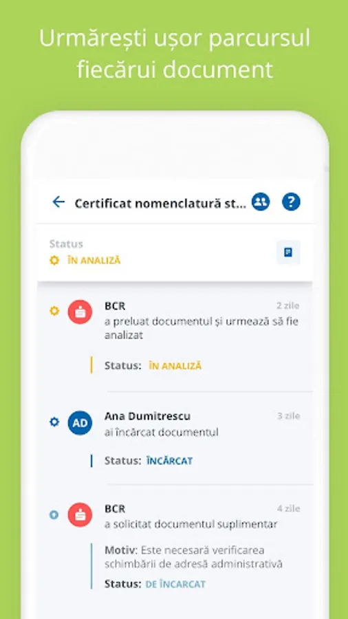 • View loan stage and details (requested loan type, amount, period, interest type and percentage, APR, etc), time estimates (determined by BCR for loans of the same type, based on its own records) and stage resolution