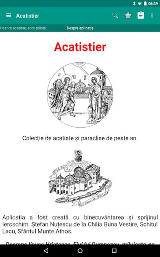 The application was created with the blessing and support of Ieroschim. Ștefan Nuțescu from Chilia Buna Vestire, Lacu Hermitage, St. Mount Athos.