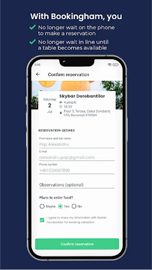 We also make sure that you won’t forget about your plans. Bookingham sends you a reminder letting you know that you have a reservation soon.