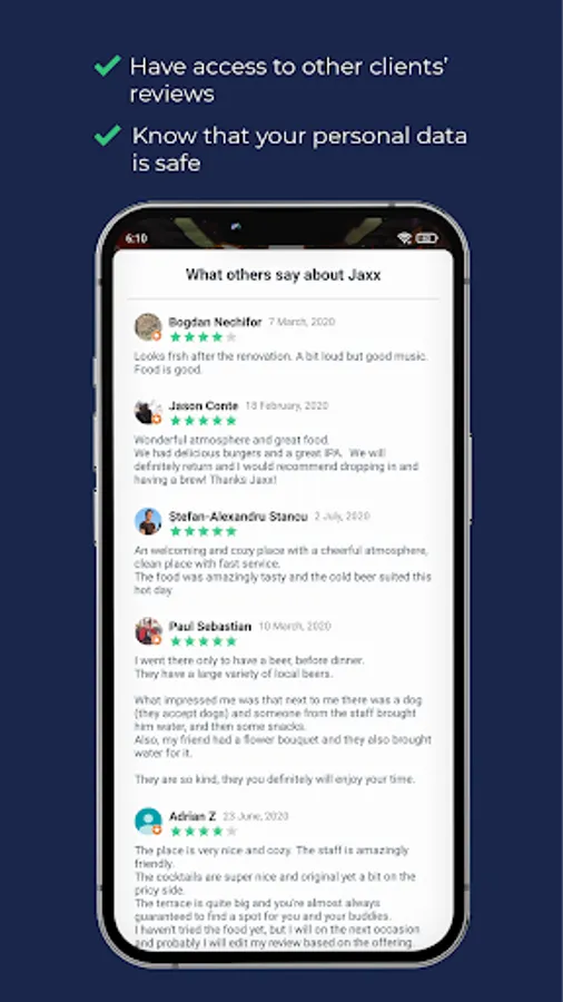 The app tells you everything you need to know about the venue: from opening hours and facilities to menu options, client reviews, and pictures.