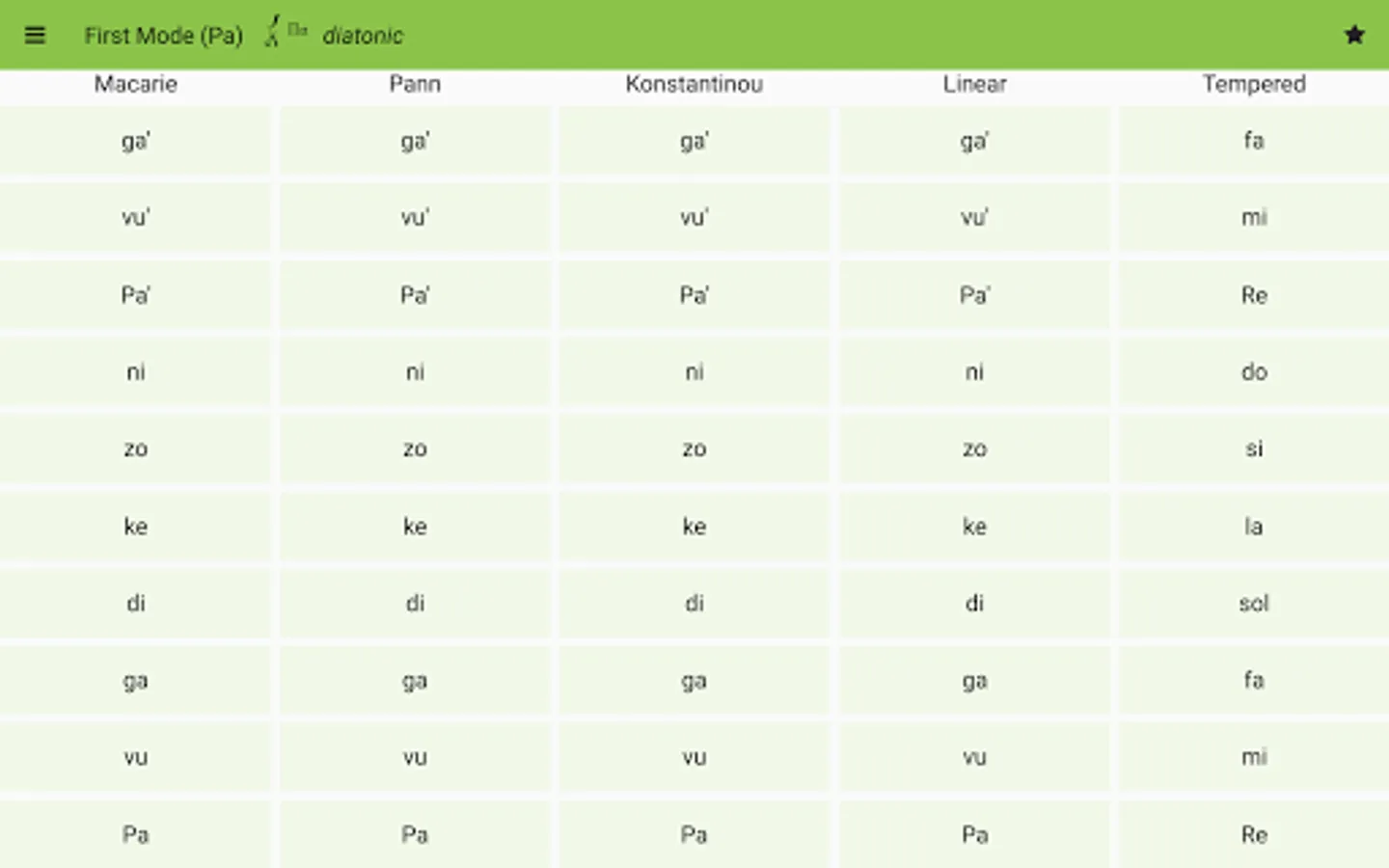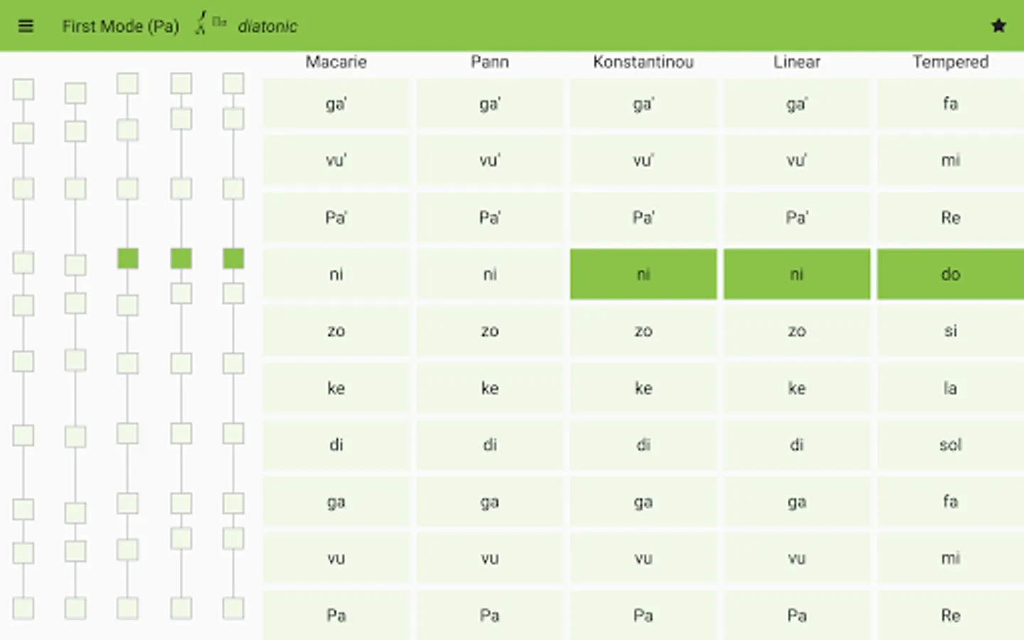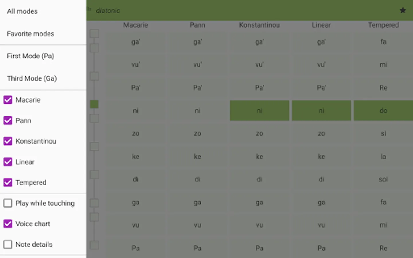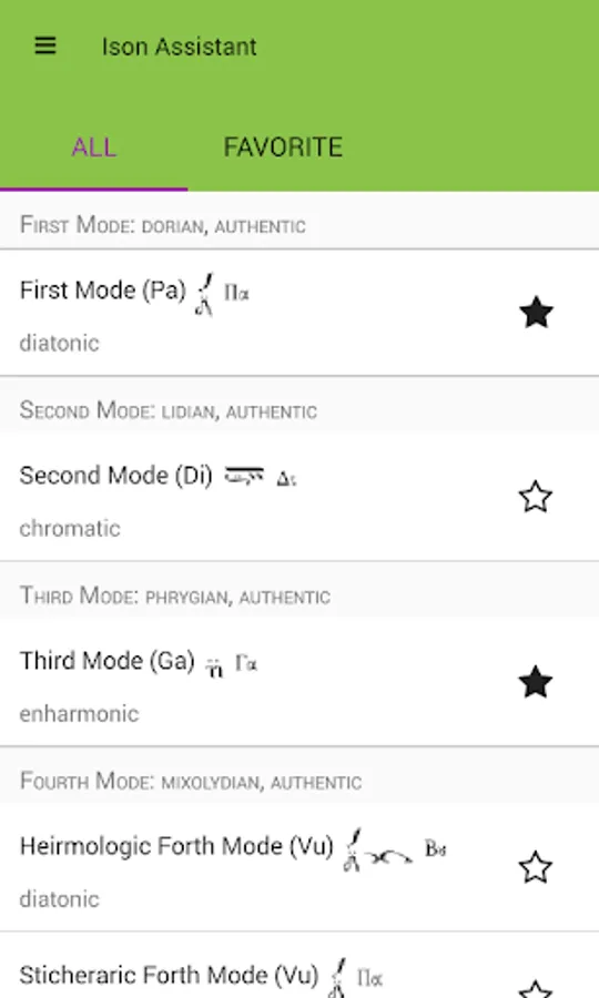 Ison Assistant displays the eight psaltic music modes using the Macarie, the Ieromonah, Anton Pann, E. Konstantinou, linear and tempered intervals.