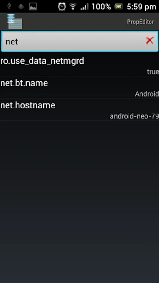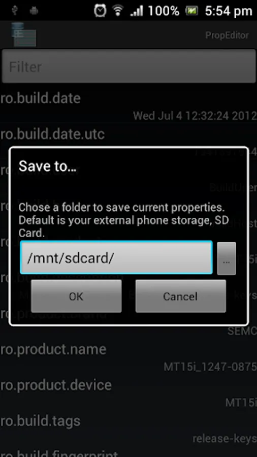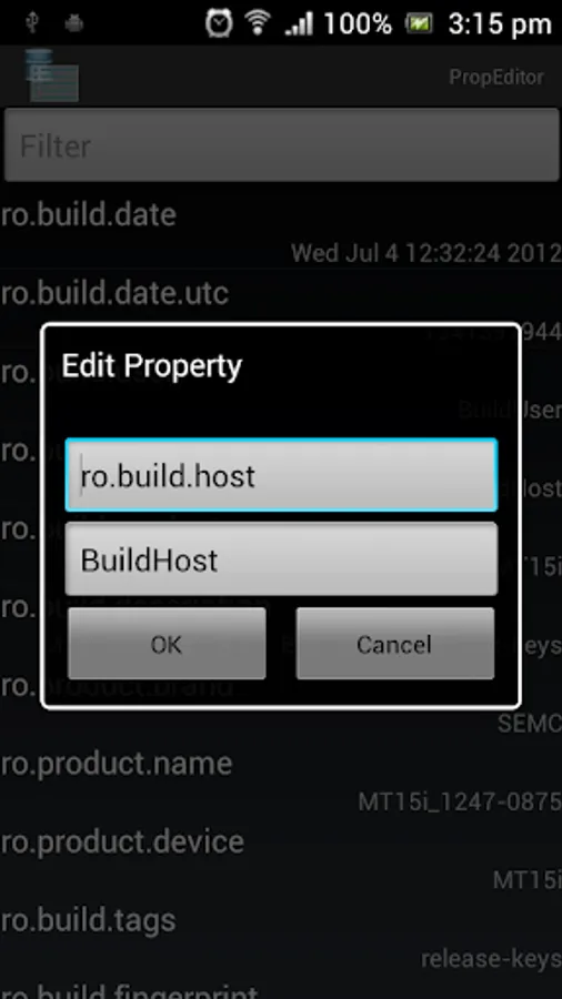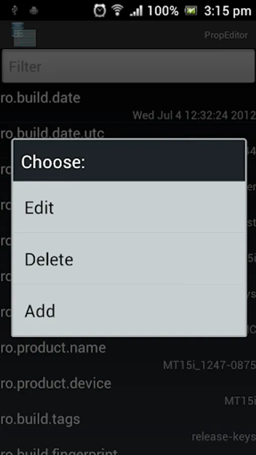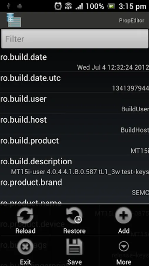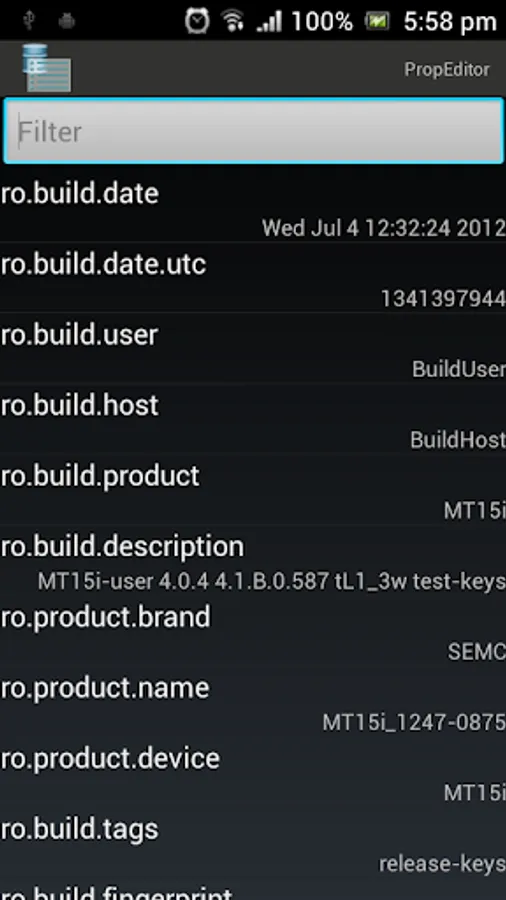 The application load the build.prop file into a list where the user can use a filter for a more accurate searching.