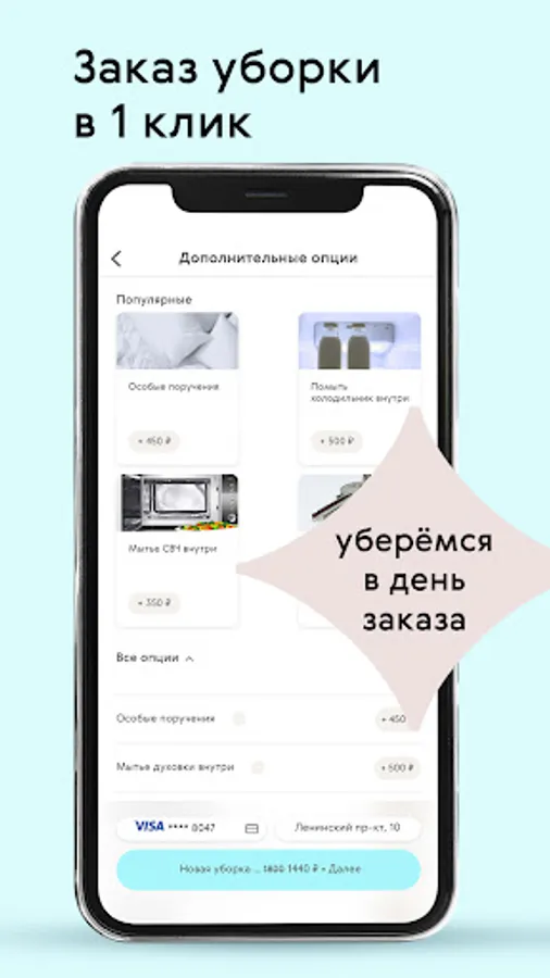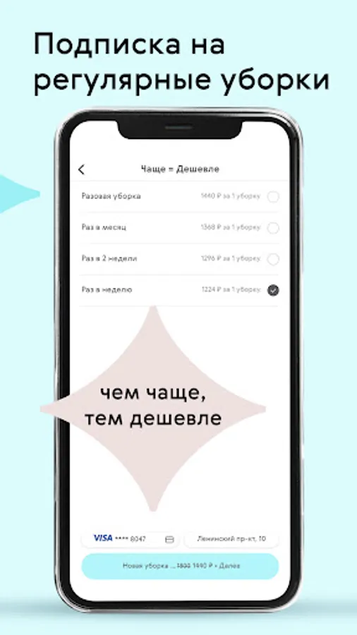 Create your cleaning schedule and our cleaner will appear once a week or more often. And for regular customers - a discount of up to 20%.