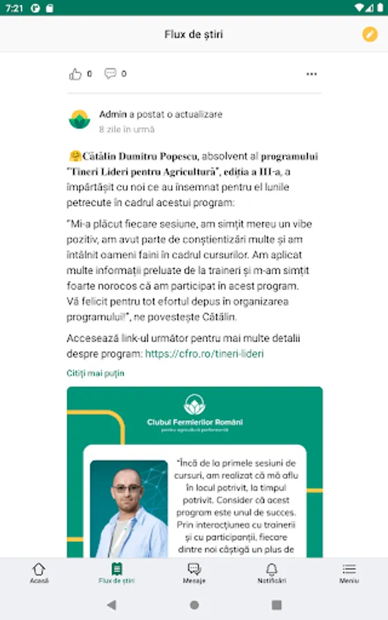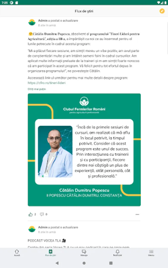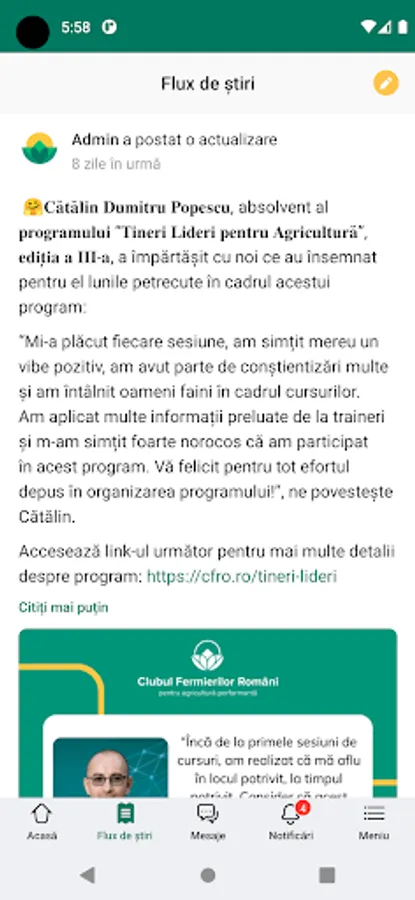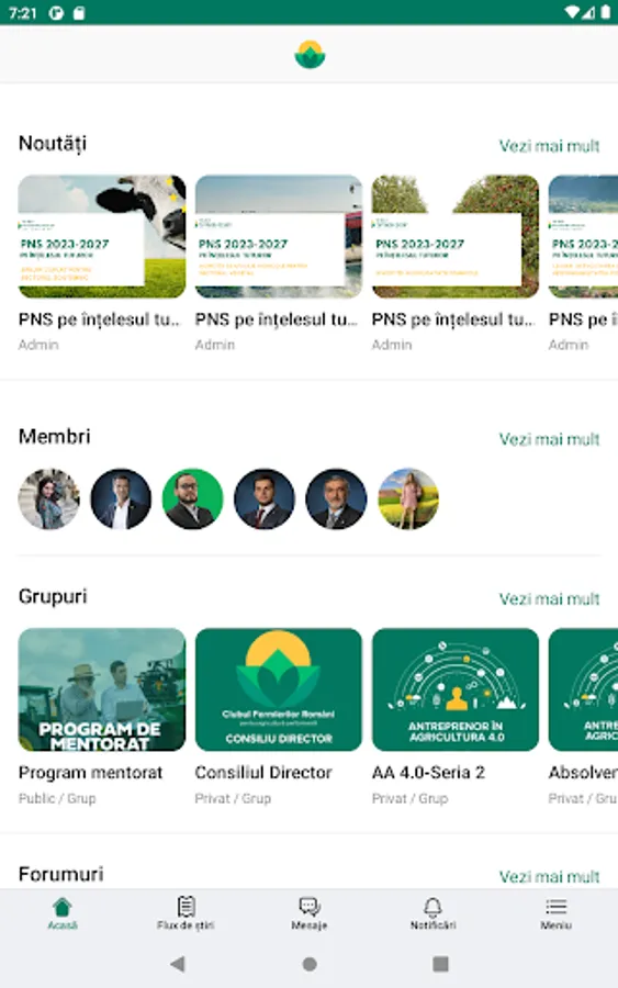 The Romanian Farmers' Club community represents an essential pillar of both the development of the agricultural sector and a balanced, sustainable and inclusive rural society. This application encompasses multiple aspects, starting from the attractiveness of using a digital platform dedicated to Romanian farmers, facilitating the transition to the new generation and the development of mentoring activities, awareness of the importance of continuous education adapted to contemporary needs, the exchange of knowledge and resources, the facilitation of services of counseling and consulting until the satisfaction of individual and collective needs.