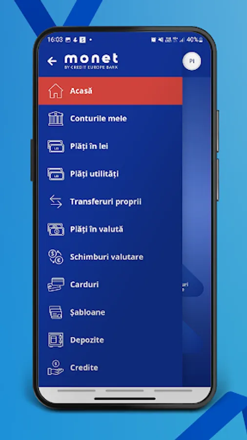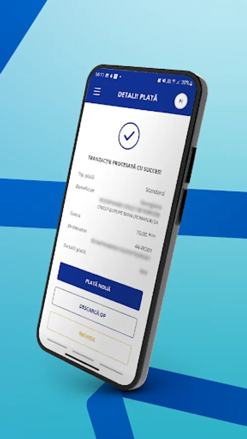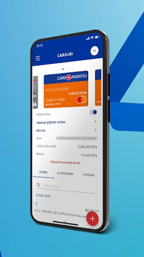 Accounts : Easily access and monitor your account details, view transaction history, generate statements, and download payment confirmations. Open current accounts (RON, EUR, USD, GBP, CHF) or savings accounts (RON, EUR, USD).
