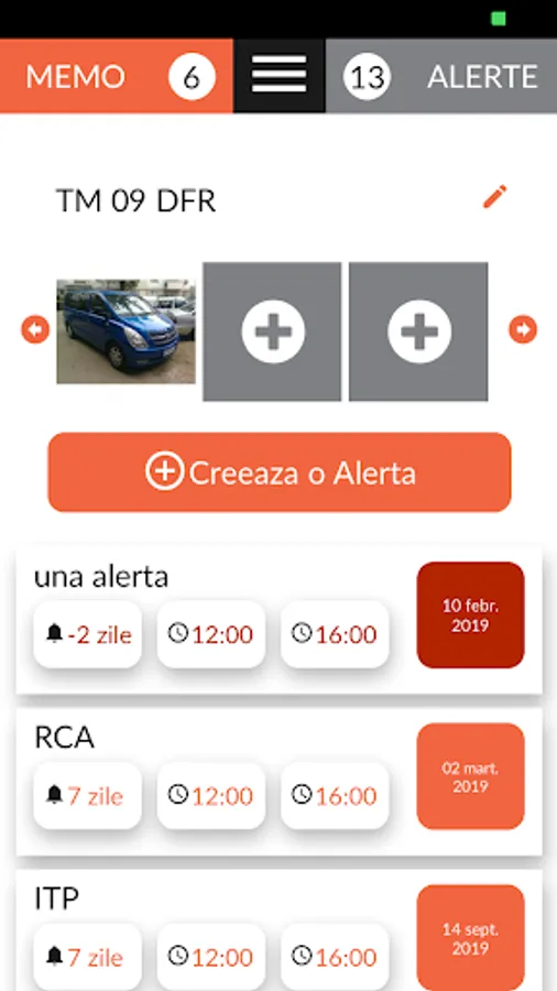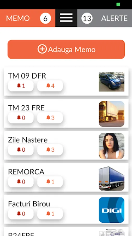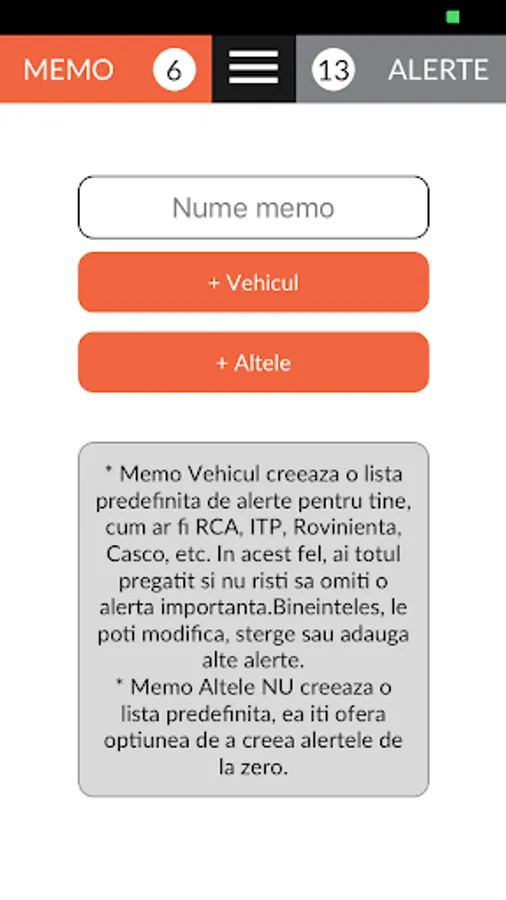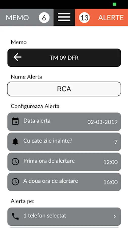 Pentru fiecare MEMO poti crea mai multe ALERTE asociate pentru masina (RCA, ITP, CASCO, Rovigneta, Tahograf, Cauciucuri, Ulei etc), dar si pentru alte utilitati lunare (Gaz, Apa, Curent electric, Ipoteca, Credit, etc.). MEMO-urile pentru masini au deja predefinite o serie de ALERTE uzuale.