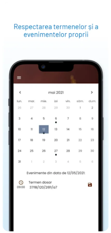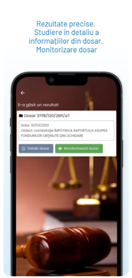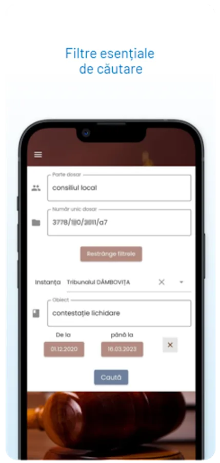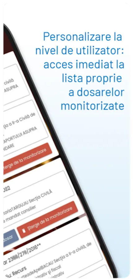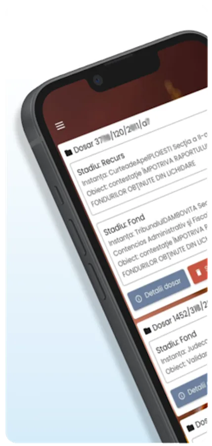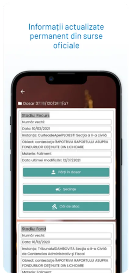 The Dosare instanță application complies with security standards, offers ease of use and perfect accuracy of content, permanently synchronized with the court portals: portal.just.ro and iccj.ro.