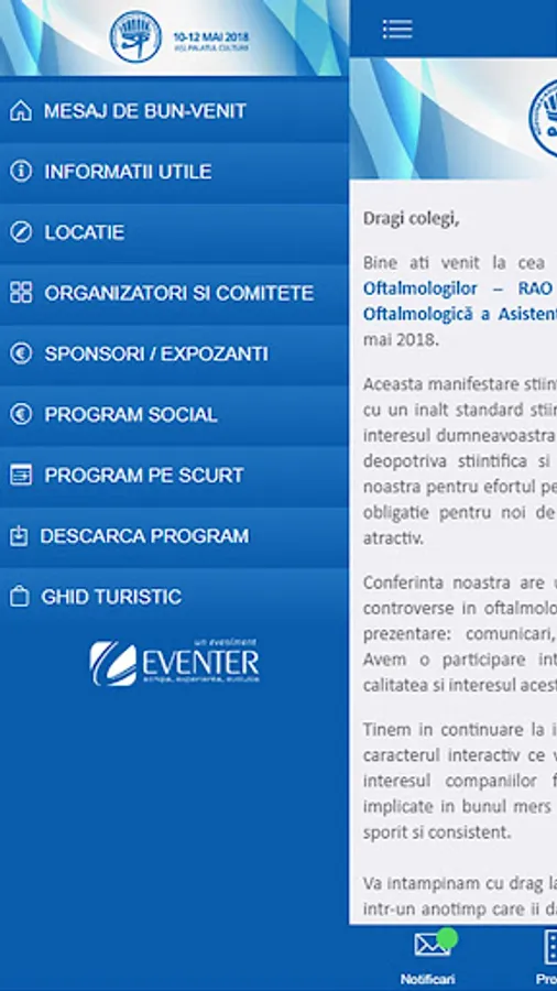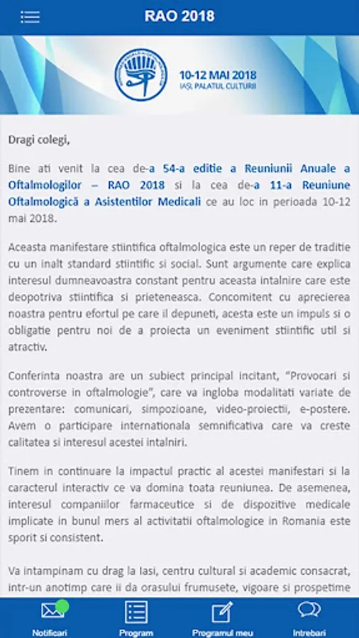 We are honored to invite you to the works of the 54th edition of the Annual Meeting of Ophthalmologists - RAO 2018 and the 11th Meeting of Ophthalmic Nurses to be held in Iasi between 10 to 12 May 2018 .