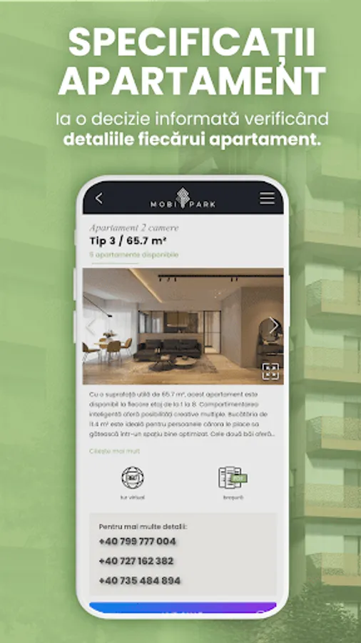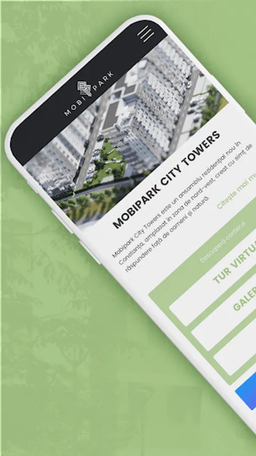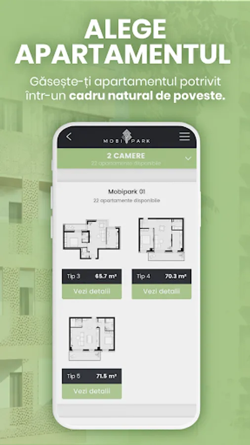 You can schedule a visit to the Mobipark showroom or you can choose the apartment you want to visit, from the 9 models - studio type, 2, 3, 4 rooms or duplex. We look forward to telling you more about our innovative project.