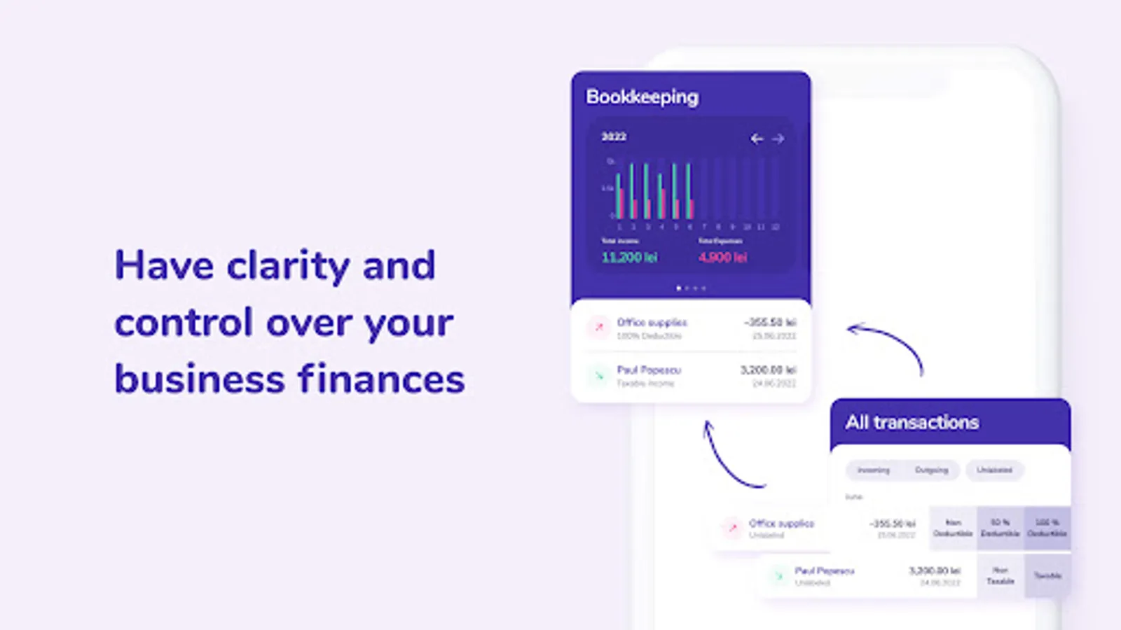 Track and label your business transactions from all your bank accounts, including cash transactions, by swiping and always know what to set aside for taxes with real-time tax calculations. See extra clear statistics of your income and expenses and generate mandatory reports in seconds, such as the Register-Journal of Receipts and Payments, the Fiscal Record, and the Inventory Register.
