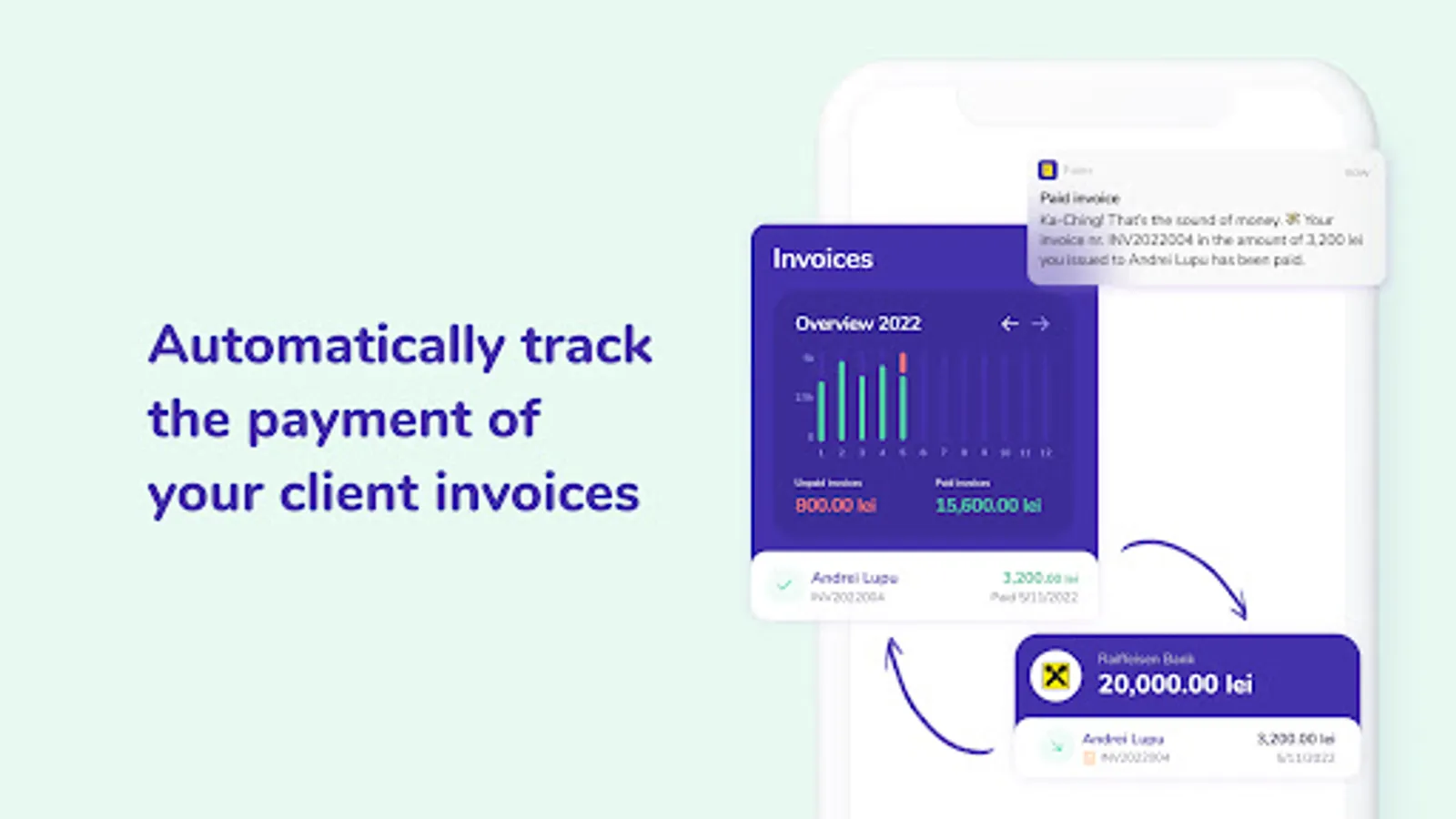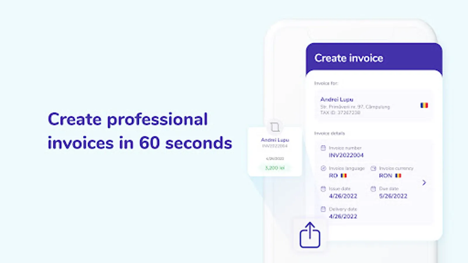 With just a few clicks, you can create professional invoices, share them with your clients and have copies stored automatically in the app, ready for tax season. Issue invoices in Romanian or English, in lei, dollars, or euros, and save time by having your invoices prefilled with your customers' data extracted directly from the ANAF database. Getting paid in cash? We've got you covered! You can generate receipts for your Fairo invoices paid in cash.