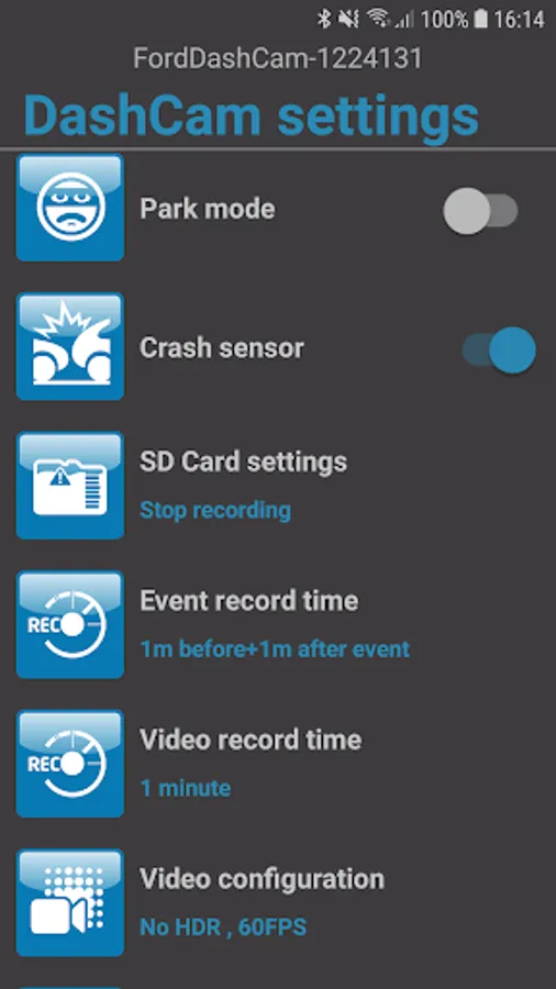 Adjust the Ford DashCam settings (e.g. video resolution, GPS enabling/disabling, Wi-Fi, etc.).