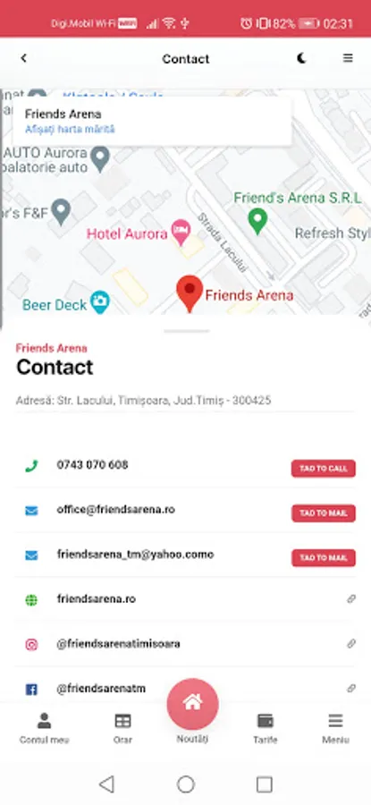 The Friends Arena sports base, located in the South of Timisoara, has a synthetic football field, tennis court, sauna, modern locker rooms, 2 fitness rooms equipped with all the necessary equipment for physical training, cardio area, crossfit area, kickboxing area or MMa, as well as adjacent gyms, aerobics room, suitable for individual or group aerobic workouts. We challenge you to train with us!