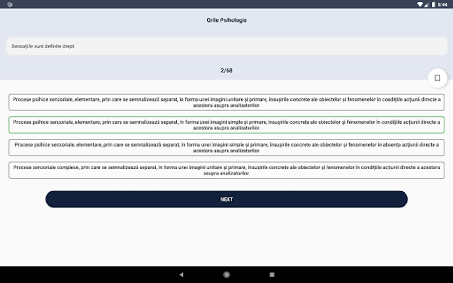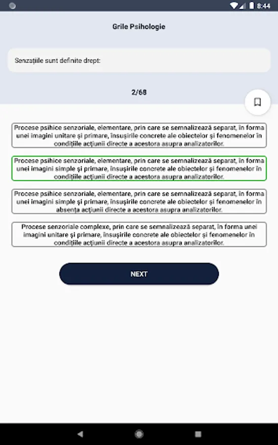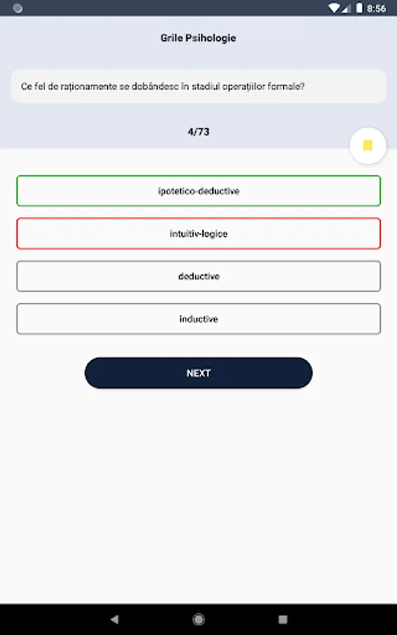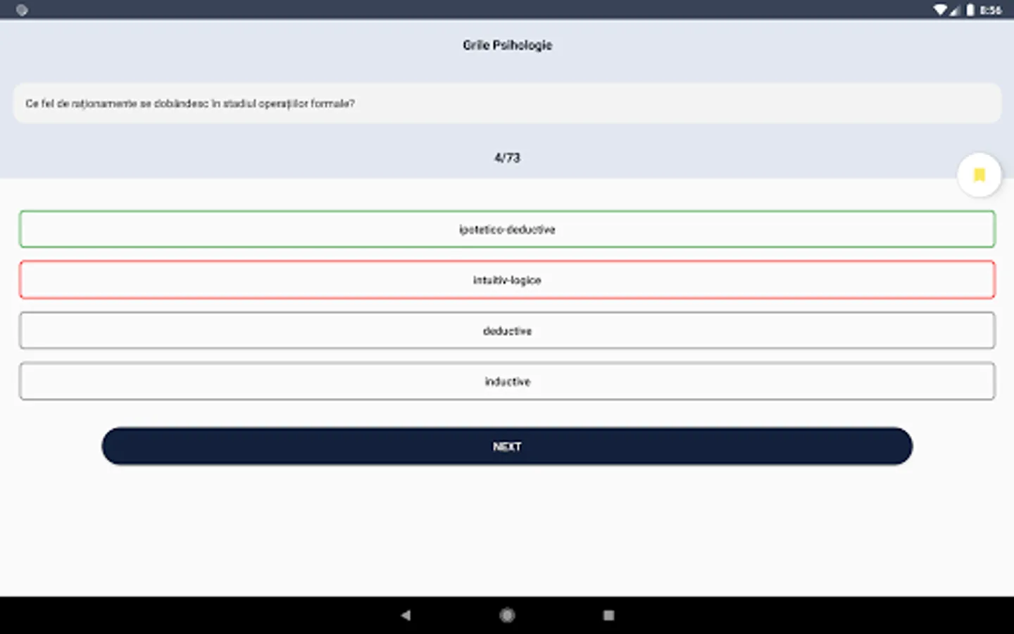 The Psychology Grids application aimed to familiarize you with the entrance exam within the Faculties of Psychology. The collection in the form of an application contains the largest number of items encountered so far in a collection for admission to the faculties of psychology. Through the application, the learning process is done in a pleasant and handy way. The items in this collection are designed to cover as much of the subject matter as possible for the Baccalaureate and Admission tests in higher education.