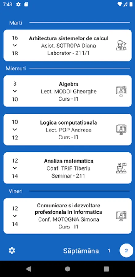 This is an unofficial application for the offline schedule of bachelor's and master's specializations within the Faculty of Mathematics and Informatics of Babeș-Bolyai University Cluj-Napoca