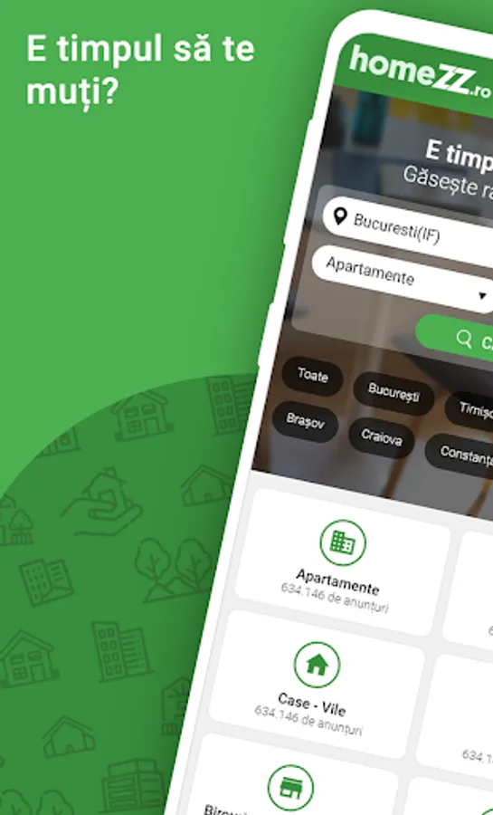 E timpul să te muți? Instalează gratuit aplicația HomeZZ.ro și găsești locuința ta ideală chiar astăzi! În cazul în care dorești să cumperi o locuință nouă, pe HomeZZ.ro vei descoperi anunțurile care te vor inspira în alegerea unui nou cămin pentru tine și familia ta. Cauți să închiriezi un apartament? HomeZZ.ro te ajută să fii la curent cu cele mai bune oportunități pentru nevoile tale.