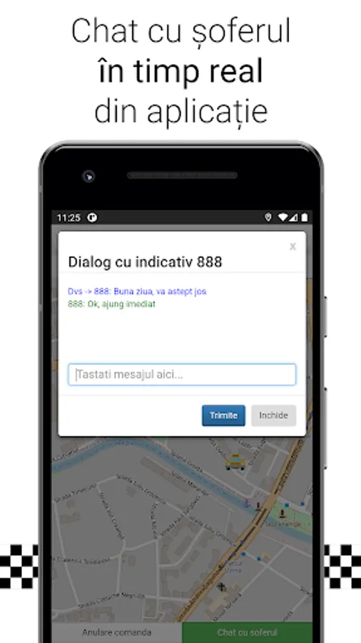 Your connection is direct with the nearest available taxi, without the intervention of any dispatcher. Surely the chat with the driver will use you.