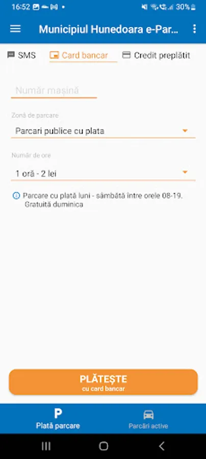 "Municipiul Hunedoara e-Parking" is an official application of the City Hall of Hunedoara Municipality. The application allows the payment of rates for the occasional use of public parking lots.