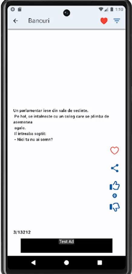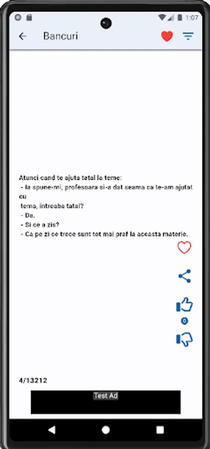 This application is a fun and complex source of jokes from Romania, containing more than 13,000 jokes and updated daily with new ones. The app offers a diverse range of joke categories, such as Alinuța, Animals, Ardeleni, Olteni, Moldoveni, Army, Lawyers, Drunks, Bula, Computers, Miscellaneous, Doctors, Ion and Maria, Politicians, Police, Dull, Sir and John, Mothers-in-law, Blondes, Romanian Jokes. With this app, you have at your fingertips one of the most complete and updated lists of Romanian jokes and puns, which can be accessed both online and offline. It offers you a catalog of funny messages, ready to be read anytime, anywhere. Have fun with the funniest jokes from Romania with this app! It is important to note that the app may contain vulgar language. Download this app now and enjoy a pleasant and amusing experience!