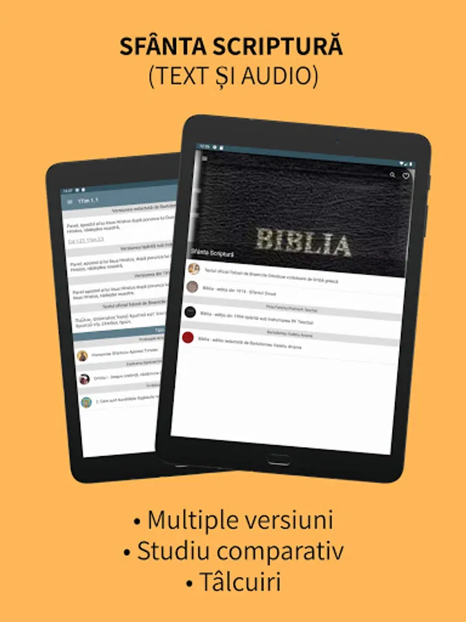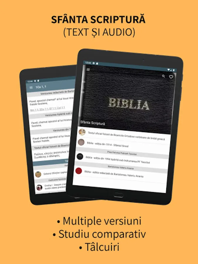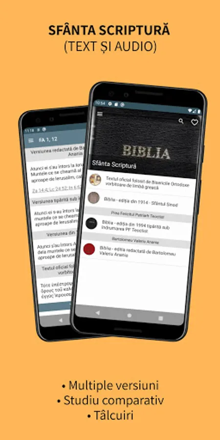 3. The Bible (Holy Scripture) in 4 versions: the 1994 edition printed under the guidance of His Beatitude Theoctist, the edition written by Bartholomew Valerius Ananias (footnotes and references included), the 1914 edition of the Holy Synod (New Testament only), the Greek edition old. You can compare the 4 versions and see the references from the books in the application library to a specific verse (you can see an interpretation of it by the Holy Fathers).