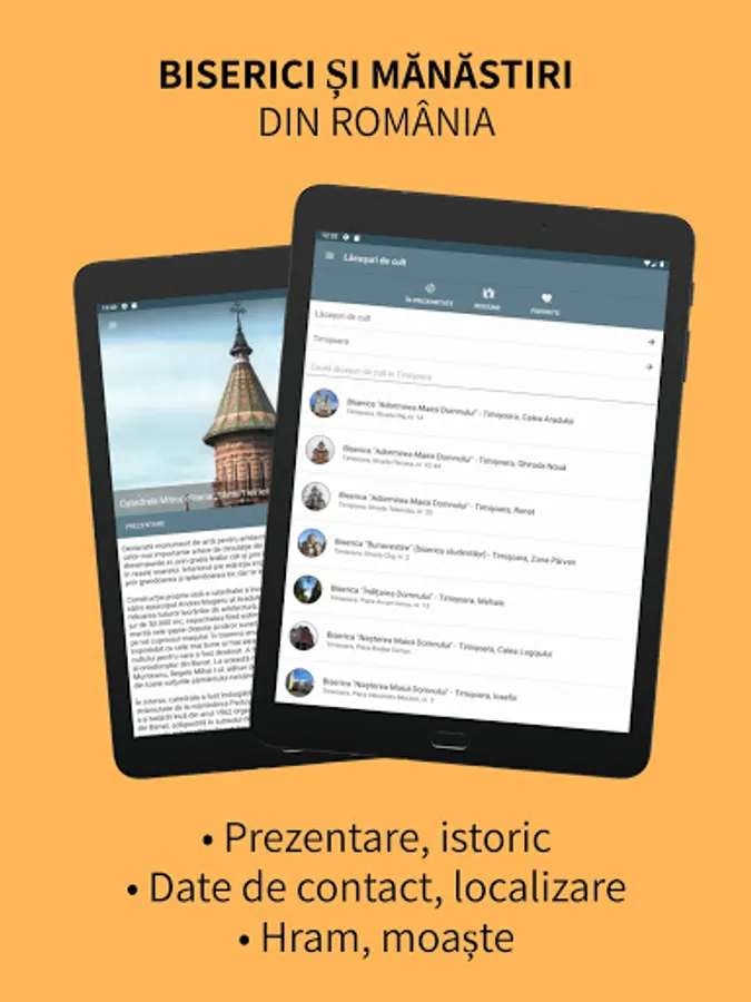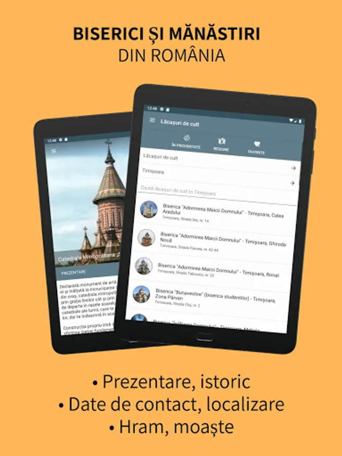 2. Churches / monasteries grouped by cities, counties, regions, bishops, metropolises, etc. or depending on your proximity to your location. Places of worship have information such as: presentation, history, contact details, presentation videos, gps location (you can view the route from your location), patron saint, relics of saints (if any), ministering priests. Currently, most of the monasteries and hermitages in Romania and the churches in Timiș County are introduced, and with God's help we will introduce all the Orthodox places of worship in the country and abroad.