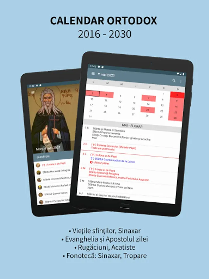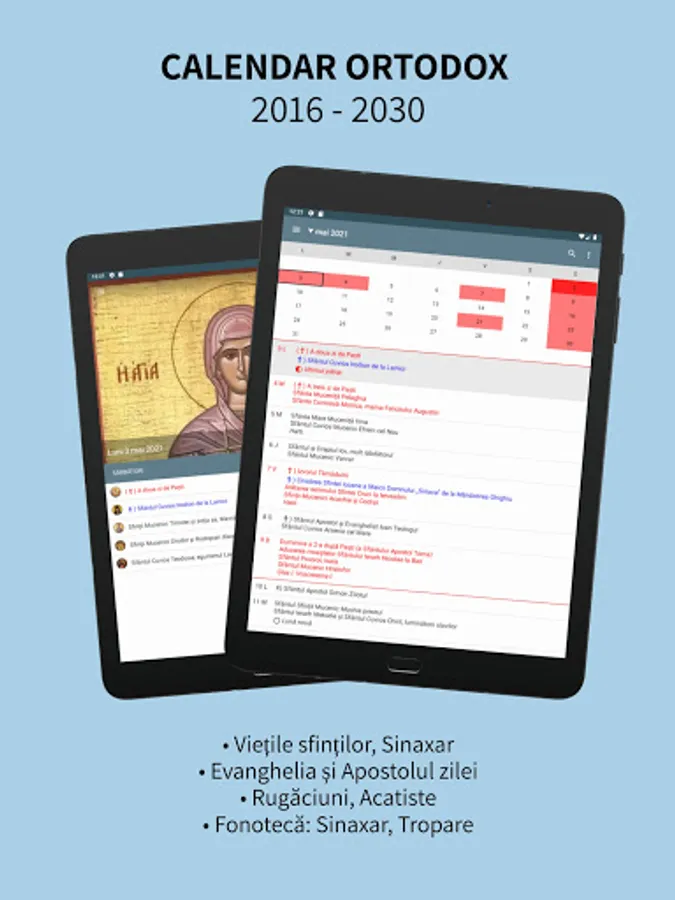 1. The calendar presents information on the feasts of the day: the saints of the day with their icons, the Lives of the Saints (wide version), the Synaxarion, the Prologues, the Prologues of Ohrid, the Sermons, the Gospel and the Apostle of the day, the Troparion, the Condache, the Akathist, the Canons, etc. The calendar provides information for the period 2022-2030 and allows for keyword searches. The calendar changes depending on the selected diocese / metropolis (there are holidays that are in red only in a certain area) or you can switch to the old style to be able to follow the holidays in places where this ordinance is kept (Holy Mountain, Jerusalem, etc. .). We also offer an index of the saints both alphabetically and according to the period in which they lived.
