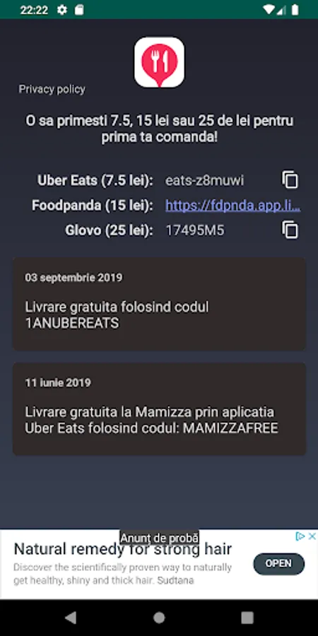 Daca activati unul dintre acele coduri la prima comanda pe una dintre acele platforme veti primi automat un discount la prima comanda de 7.5, 15 sau 20 de lei. De asemenea aplicatia va trimite notificari atunci cand vor exista promotii valabile la cei 3 furnizori de delivery.