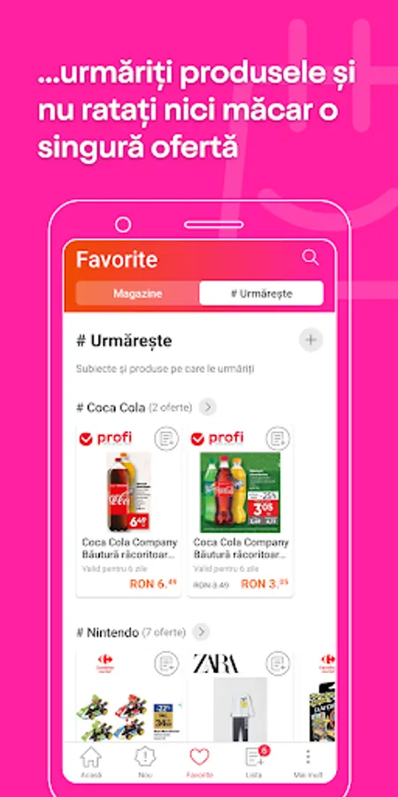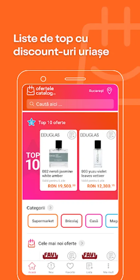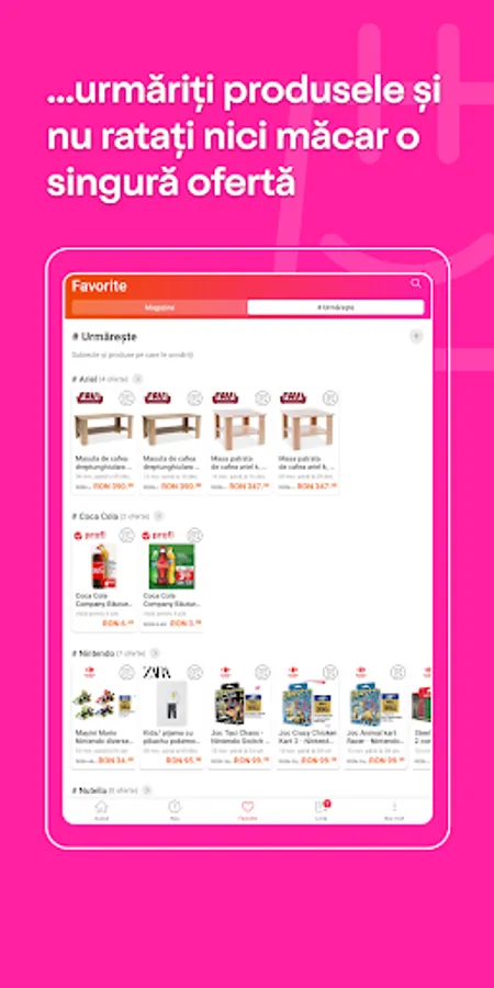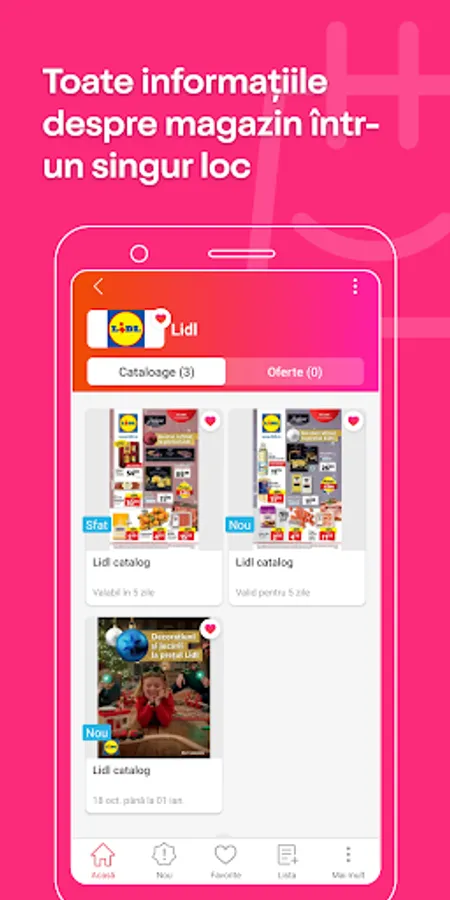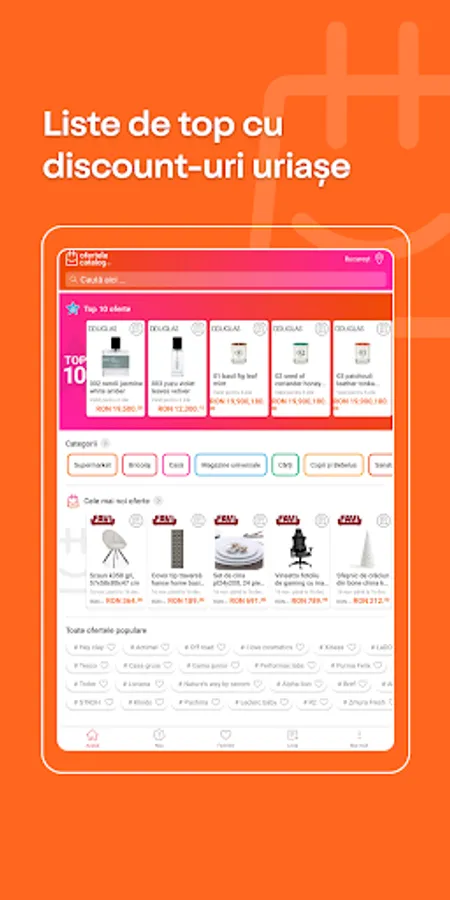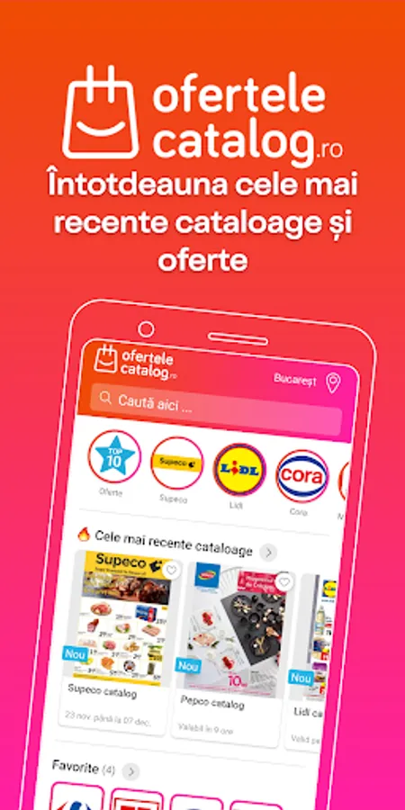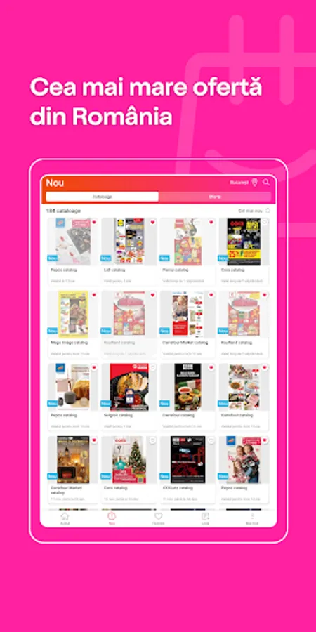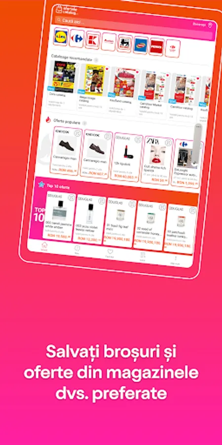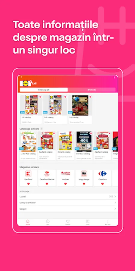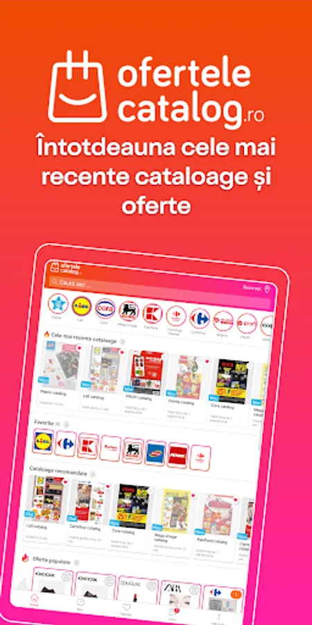 Our Ofertelecatalog.ro application presents you with all the current catalogs edited by small stores and large store chains in Romania, and not only grocery stores and supermarkets, but also electronics stores, fashion stores, department stores, toy stores, pharmacies and many more others. We've even included top local stores. If you want to add a store to your favorites, you can do so by clicking on the heart symbol. In this way, you will always be the first to know about any promotion taking place in your favorite stores and you will create a collection always at hand with all your favorite catalogs.
