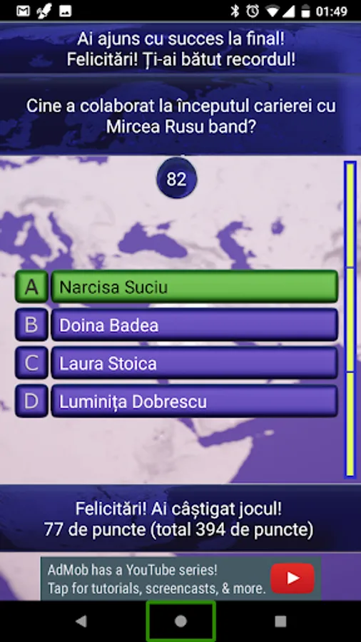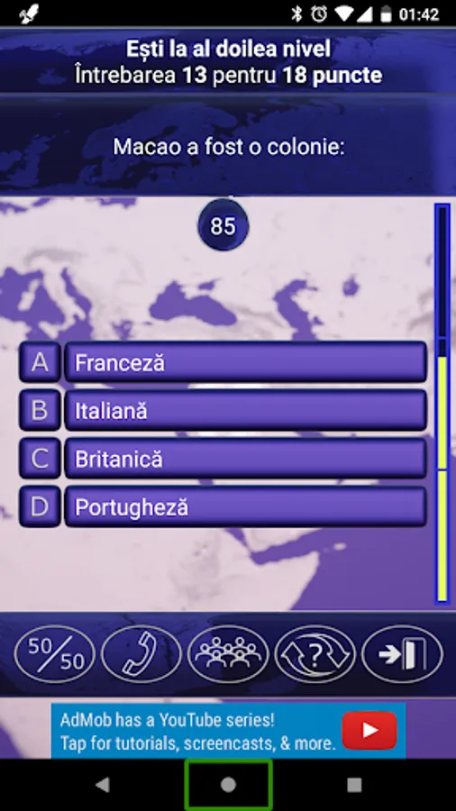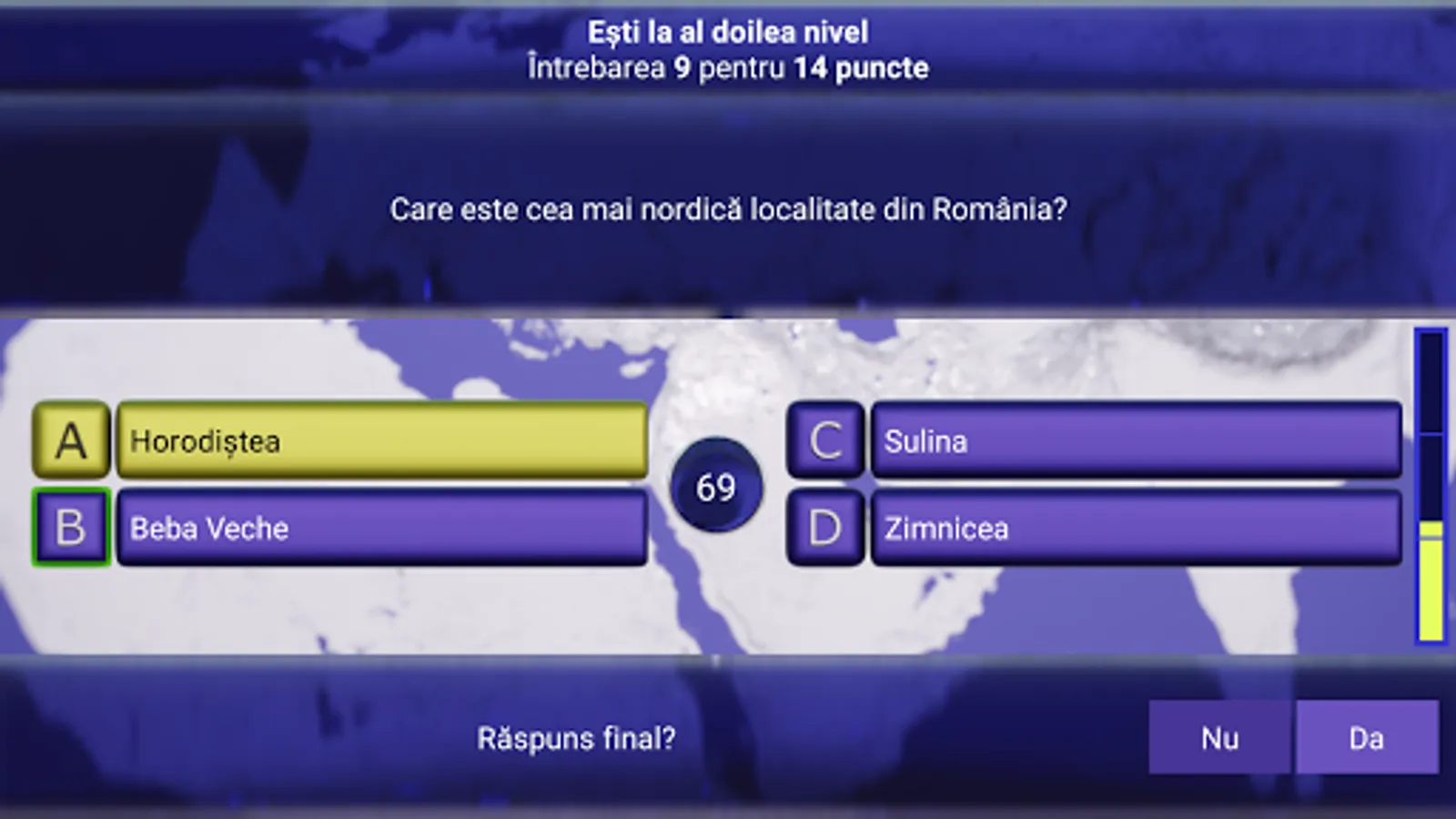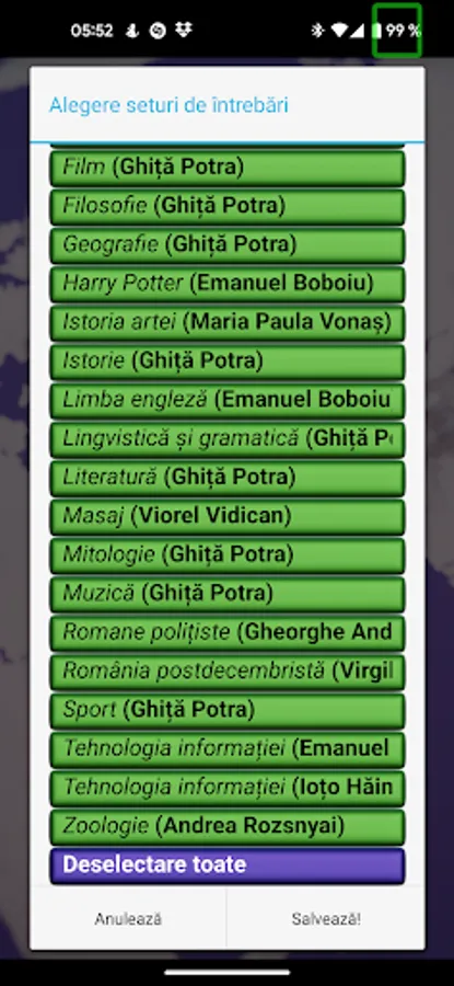 The game comes with a database of thousands of general culture questions in various fields such as: literature, film, art, mythology, music, sports, history, politics, biology, linguistics and grammar, English, antiquity, information technology / computer science , Bible / religion, anatomy, zoology, capitals, massage and more.