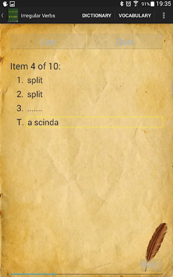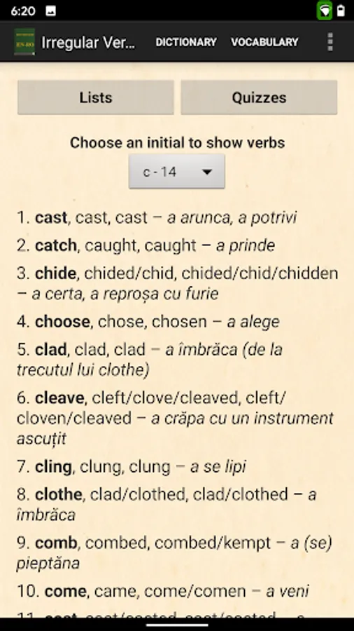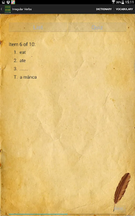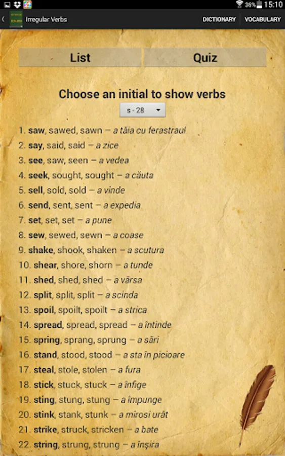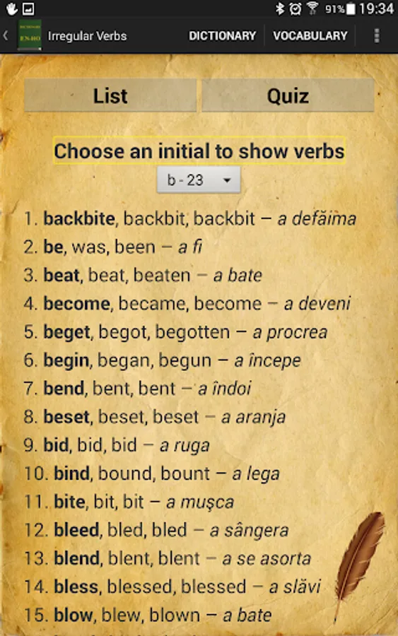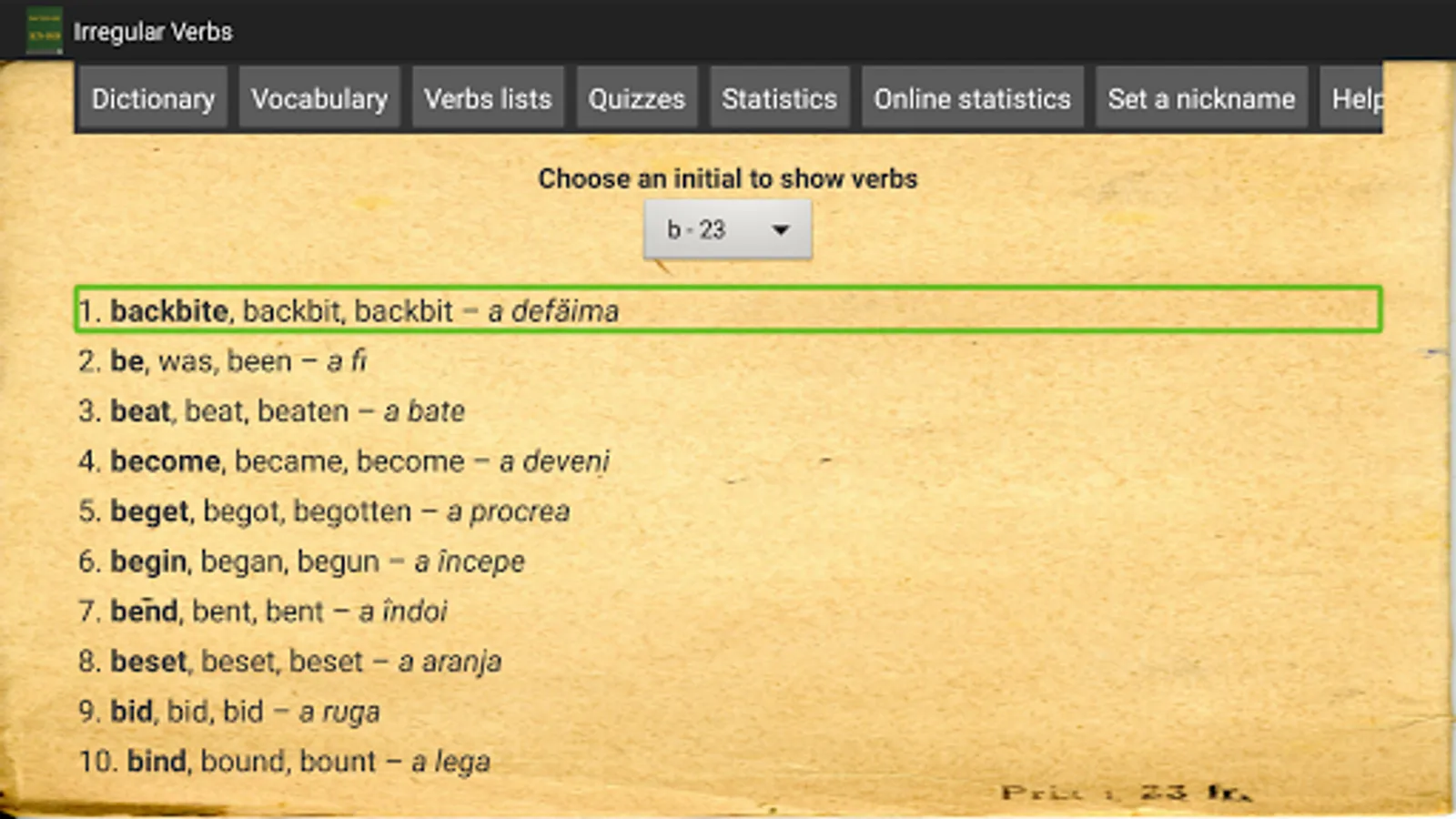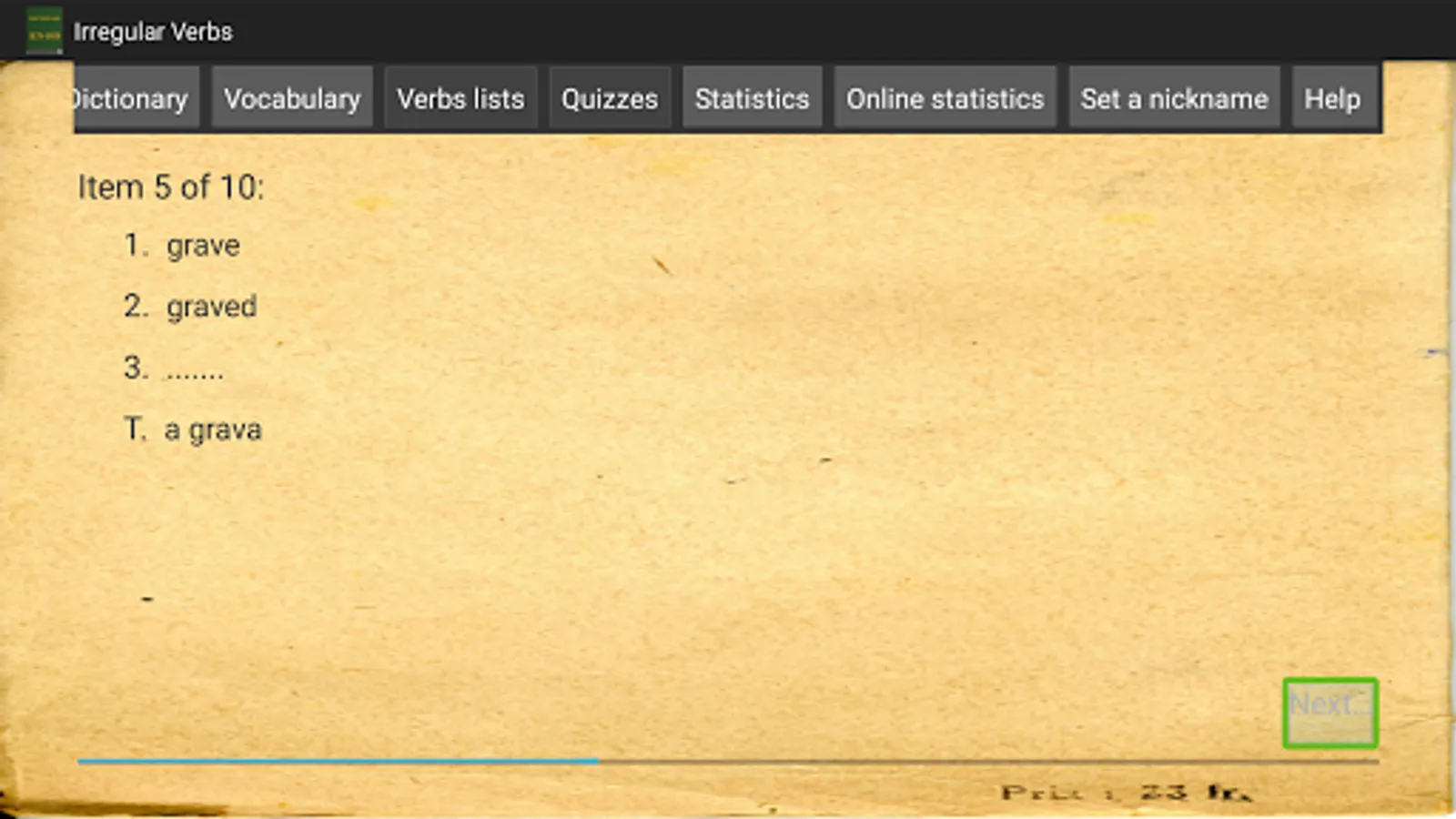 In this module you can view lists of irregular verbs, you can solve quizzes. It is possible the customization of tests choosing which forms to fill. After a test the system gives you a grade. The history of last grades, the average of all grades or of the last five can be seen.