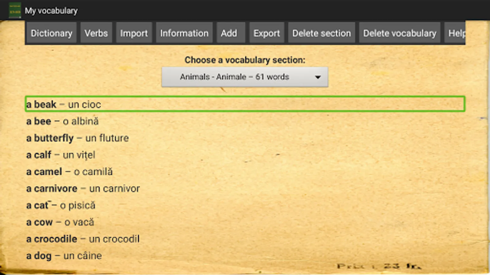 This is a module which allows you to add individual words and their explanations into a separate database. The first option in the context menu which appears after a long click on a result is Add to My vocabulary. It is possible to add into an existing section or to create a new one.