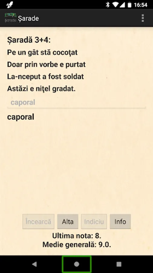 The overall average is also calculated, by pressing the Info button you can find out the number of charades untied over time, the overall average, information about the structure and the author.