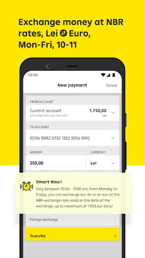 • Smart Hour - BNR exchange rates: Exchange between RON and EUR at the NBR exchange rate from Monday to Friday 10:00 - 11:00.