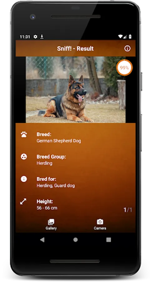 Take a picture of the dog and start sniffing in the dog database. Sniff! will find the best matching breeds for the dog in the picture. The clearer the picture of the dog, the easier it will be to find the correct match.