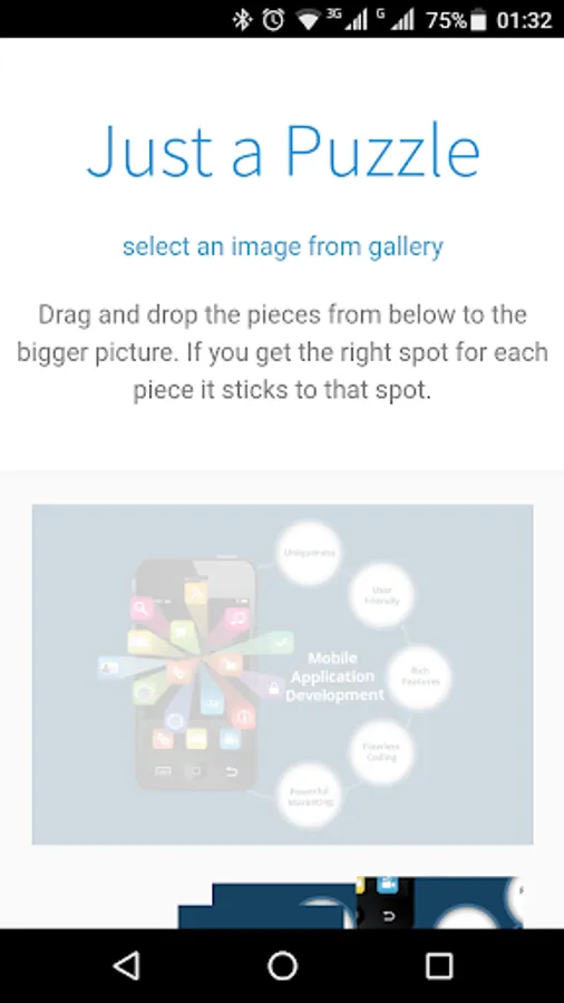 Select an image from your photo gallery and play the game. The image is cut to pieces (9, 25, 49 or 100 pieces, depending of the chosen complexity) and you have to drag and drop them into their right place. If you get the right spot for each piece it sticks to that spot.