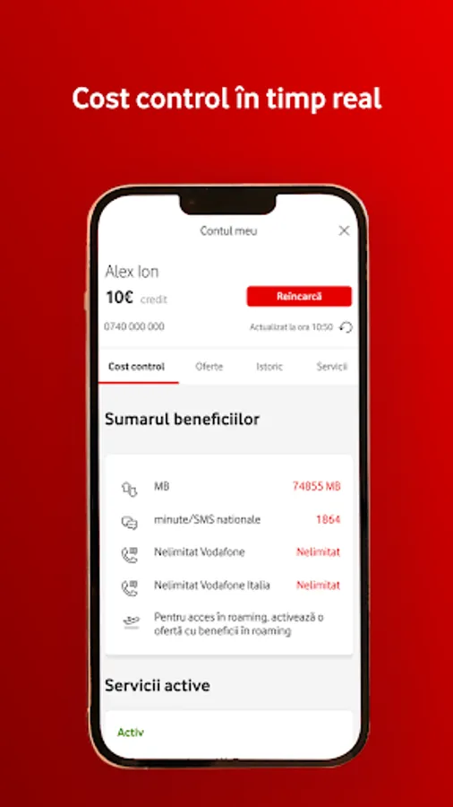 Toate serviciile tale sunt acum la îndemână, într-un singur loc - contul tău My Vodafone. Plătești factura sau reîncarci rapid o cartelă, vezi în timp real consumul tău de date, activezi sau dezactivezi serviciul de roaming și ai acces la reduceri speciale prin programul de loialitate. În plus, poți să asociezi în cont mai multe numere și poți să plătești factura sau să reîncarci cartela pentru altcineva, direct din aplicație.