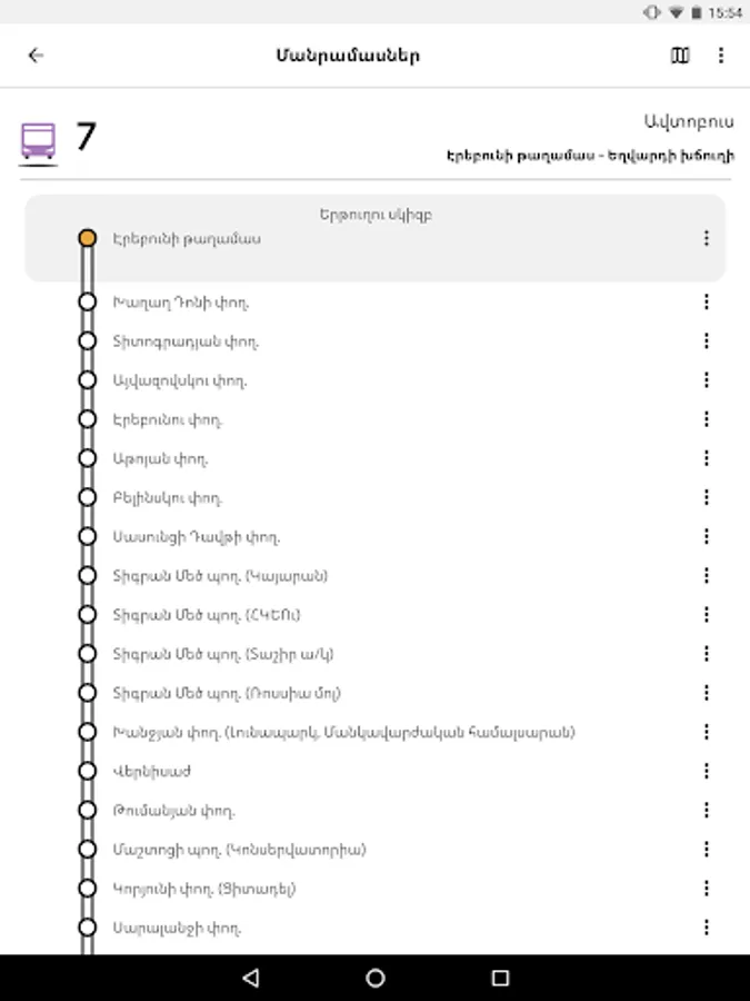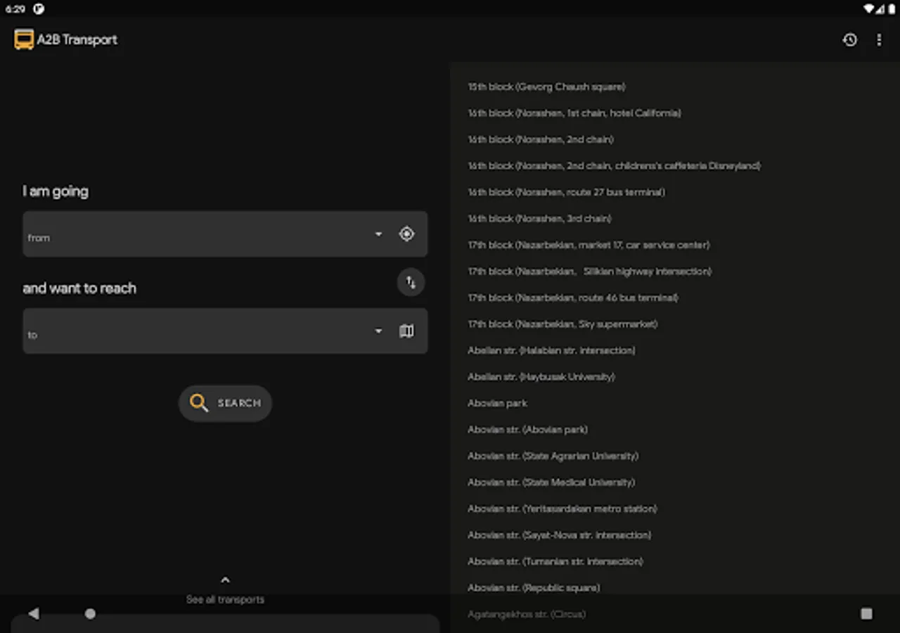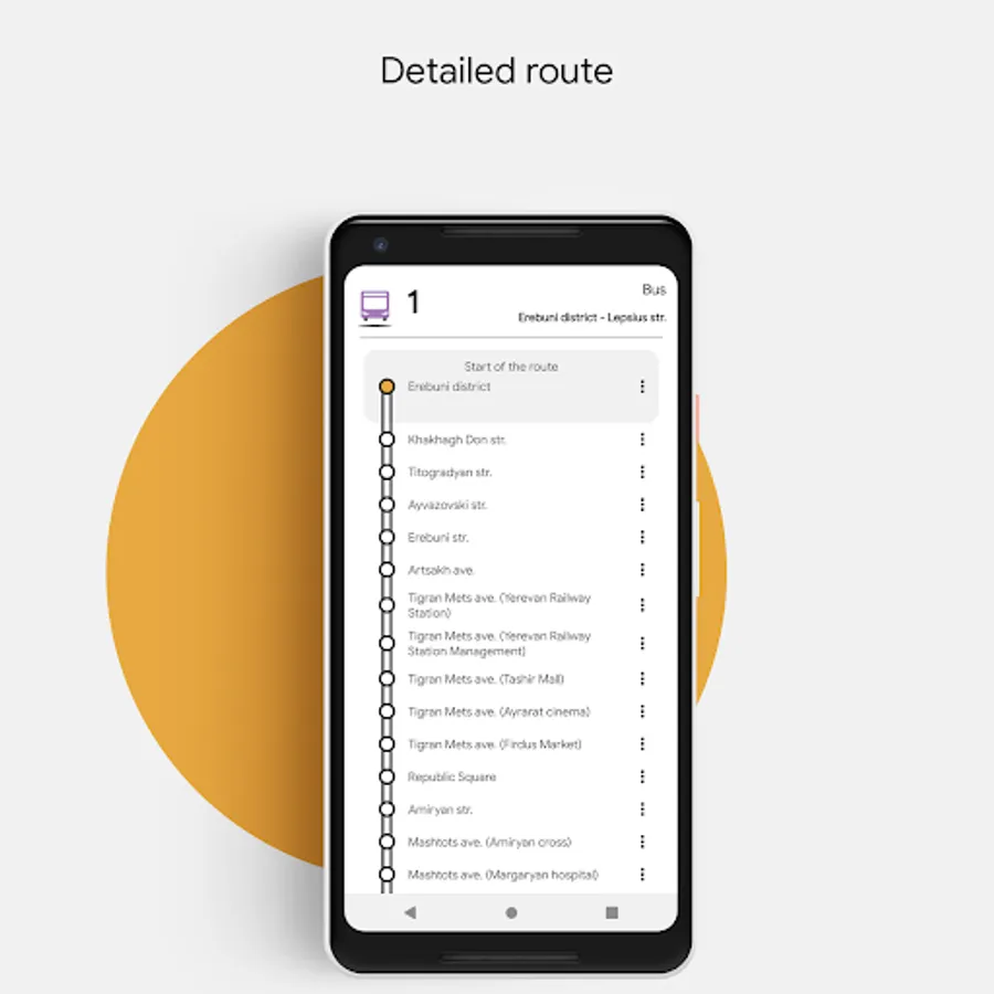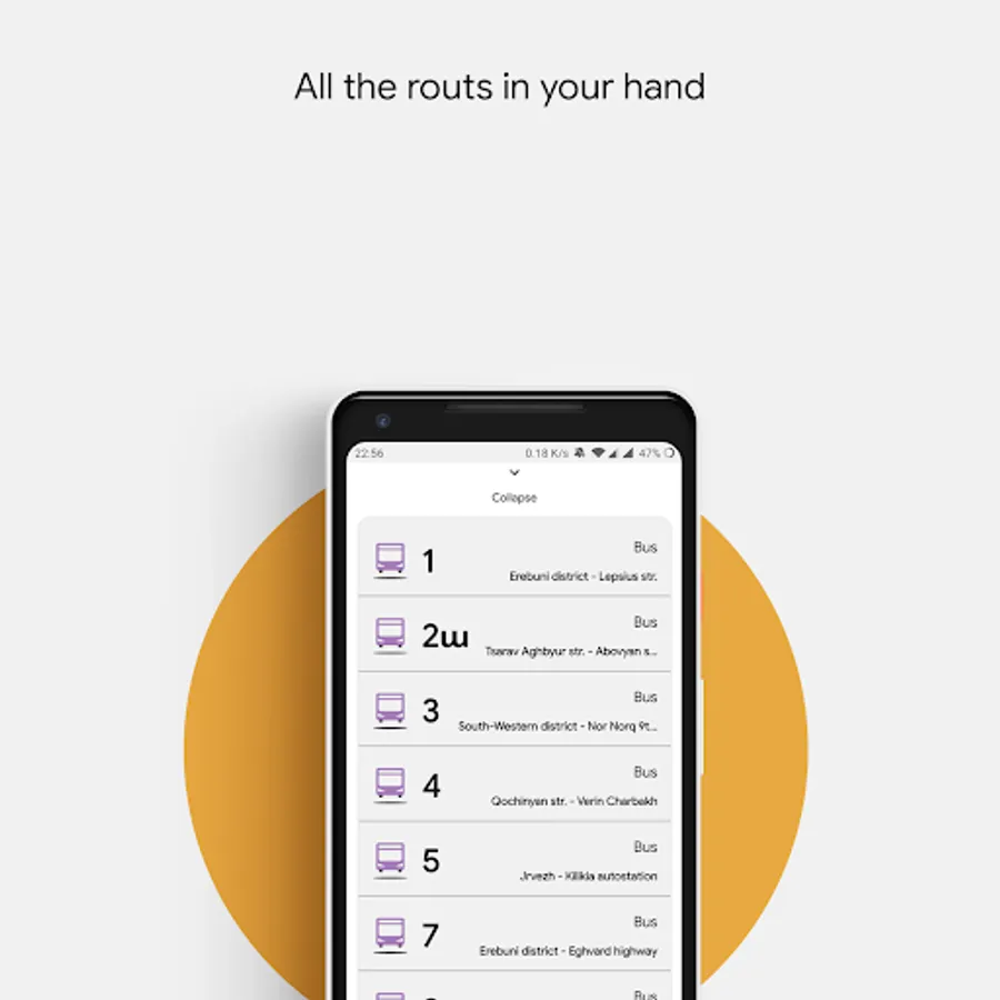 With the complete lists of all public transports and the stops of Yerevan, the app will help you to find those public transportation numbers (buses, trolleybuses or microbuses) which you need.